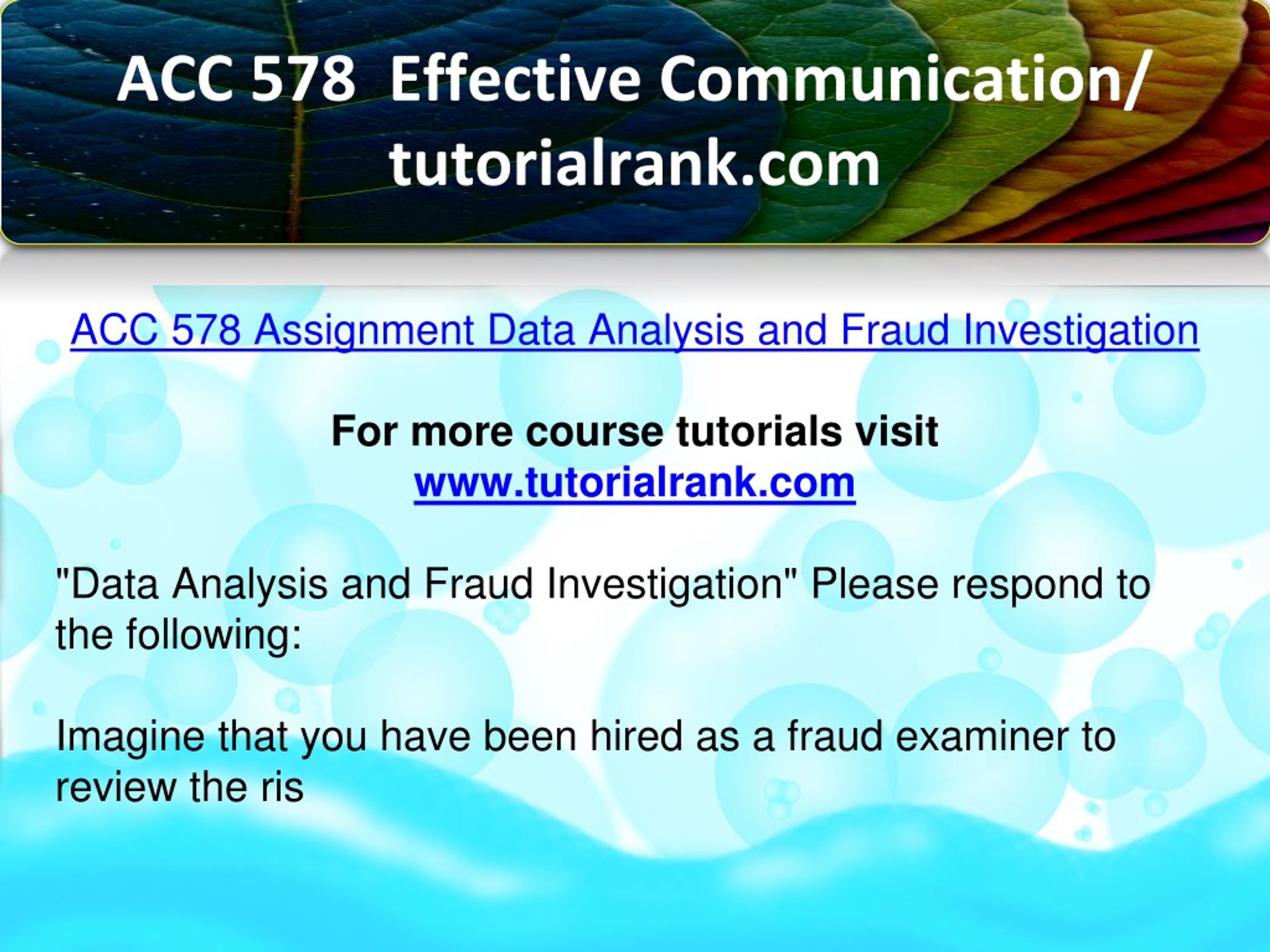 ACC 578 Effective Communication/ tutorialrank.com ACC 578 Assignment Data Analysis and Fraud Investigation For more course tutorials visit www.tutorialrank.com "Data Analysis and Fraud Investigation" Please respond to the following: Imagine that you have been hired as a fraud examiner to review the ris
