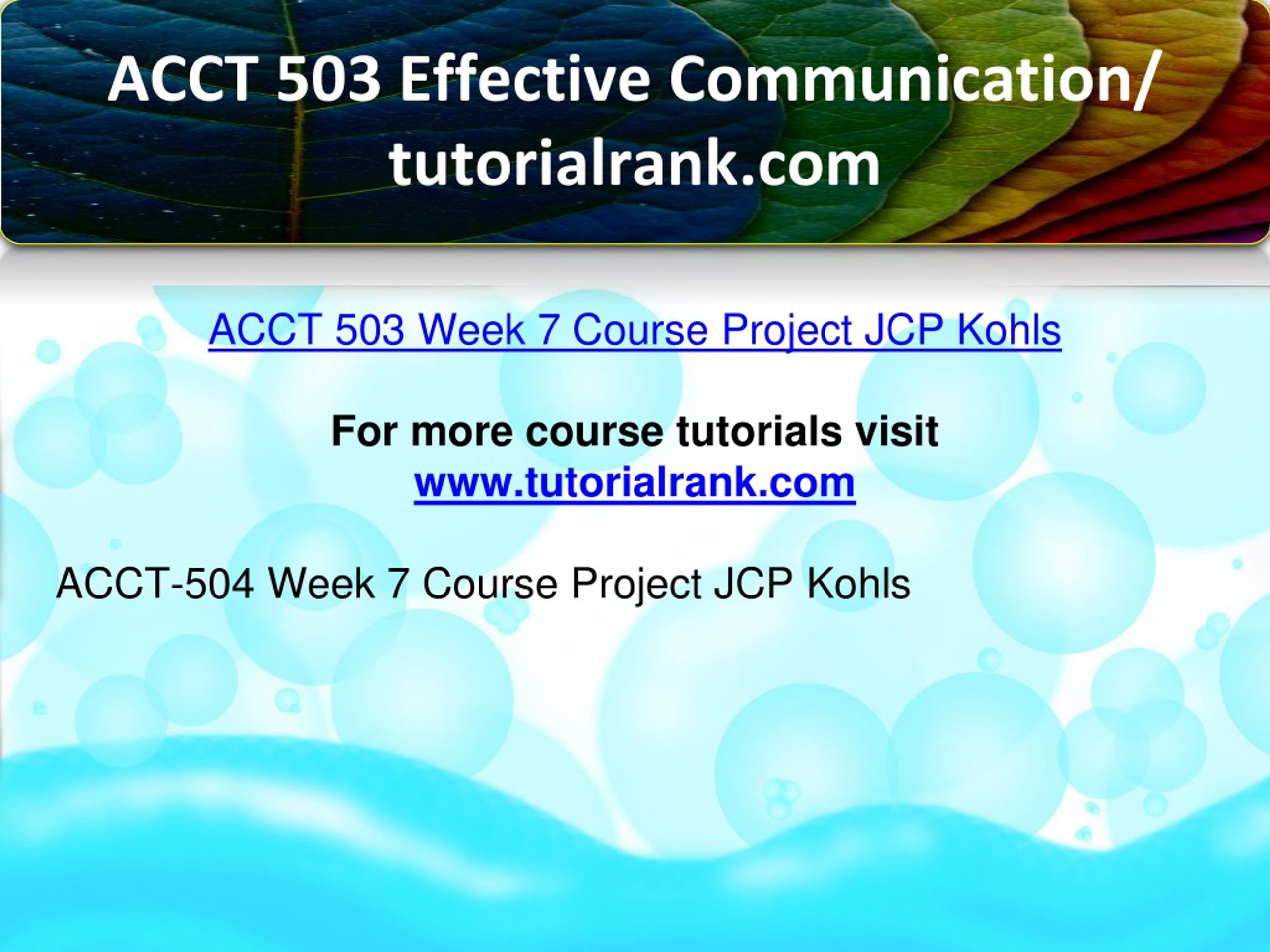 ACCT 503 Effective Communication/ tutorialrank.com ACCT 503 Week 7 Course Project JCP Kohls For more course tutorials visit www.tutorialrank.com ACCT-504 Week 7 Course Project JCP Kohls