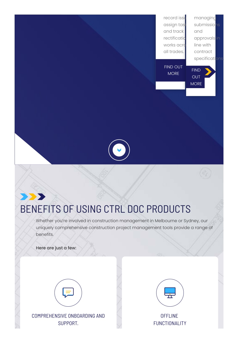 record issues, assign tasks, and track rectification works across all trades. managing submissions and approvals in line with contract specifications. FIND OUT MORE FIND OUT MORE BENEFITS OF USING CTRL DOC PRODUCTS Whether you’re involved in construction management in Melbourne or Sydney, our uniquely comprehensive construction project management tools provide a range of benefits. Here are just a few: COMPREHENSIVE ONBOARDING AND SUPPORT. OFFLINE FUNCTIONALITY