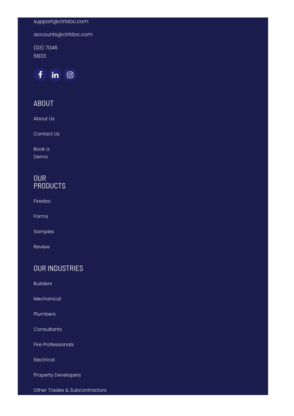 support@ctrldoc.com accounts@ctrldoc.com (03) 7046 6833 ABOUT About Us Contact Us Book a Demo OUR PRODUCTS Firedoc Forms Samples Review OUR INDUSTRIES Builders Mechanical Plumbers Consultants Fire Professionals Electrical Property Developers Other Trades & Subcontractors