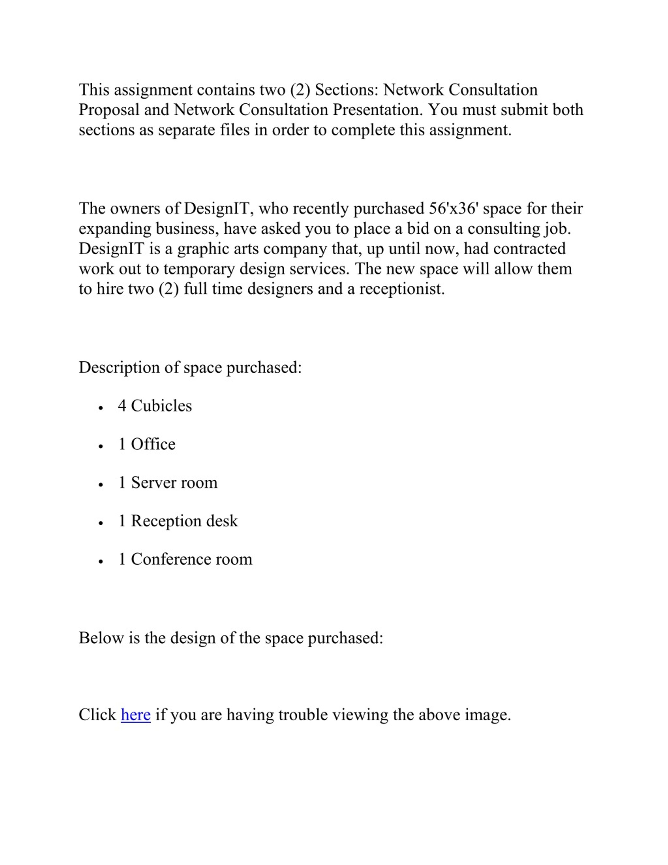 This assignment contains two (2) Sections: Network Consultation Proposal and Network Consultation Presentation. You must submit both sections as separate files in order to complete this assignment. The owners of DesignIT, who recently purchased 56'x36' space for their expanding business, have asked you to place a bid on a consulting job. DesignIT is a graphic arts company that, up until now, had contracted work out to temporary design services. The new space will allow them to hire two (2) full time designers and a receptionist. Description of space purchased: 4 Cubicles 1 Office 1 Server room 1 Reception desk 1 Conference room Below is the design of the space purchased: Click here if you are having trouble viewing the above image.