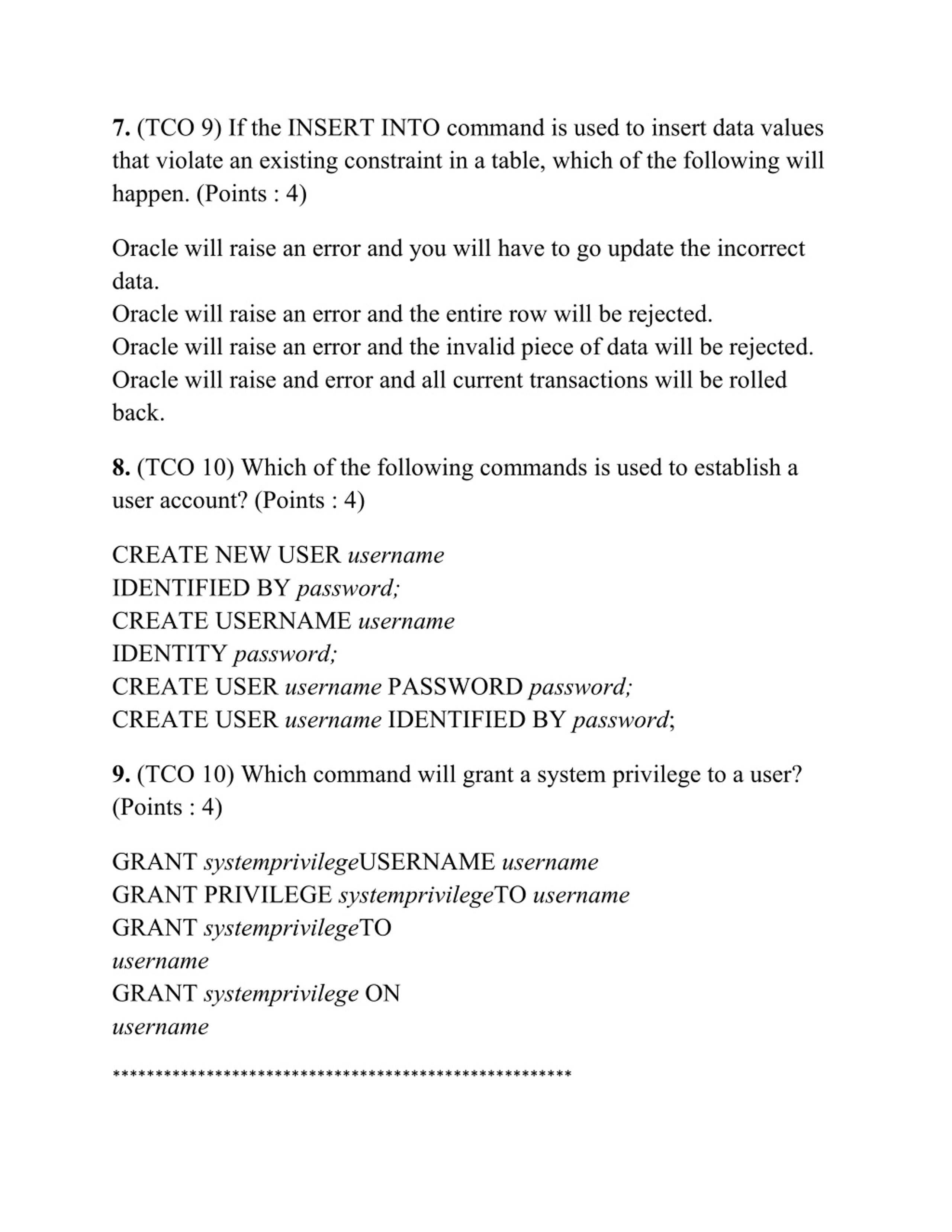 7. (TCO 9) If the INSERT INTO command is used to insert data values that violate an existing constraint in a table, which of the following will happen. (Points : 4) Oracle will raise an error and you will have to go update the incorrect data. Oracle will raise an error and the entire row will be rejected. Oracle will raise an error and the invalid piece of data will be rejected. Oracle will raise and error and all current transactions will be rolled back. 8. (TCO 10) Which of the following commands is used to establish a user account? (Points : 4) CREATE NEW USER username IDENTIFIED BY password; CREATE USERNAME username IDENTITY password; CREATE USER username PASSWORD password; CREATE USER username IDENTIFIED BY password; 9. (TCO 10) Which command will grant a system privilege to a user? (Points : 4) GRANT systemprivilegeUSERNAME username GRANT PRIVILEGE systemprivilegeTO username GRANT systemprivilegeTO username GRANT systemprivilege ON username ******************************************************
