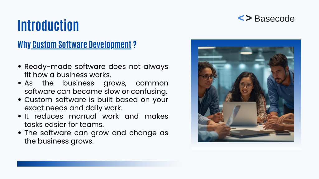 2. <> Basecode Introduction Why Custom Software Development ? Ready-made software does not always fit how a business works. As the business software can become slow or confusing. Custom software is built based on your exact needs and daily work. It reduces manual work and makes tasks easier for teams. The software can grow and change as the business grows. grows, common