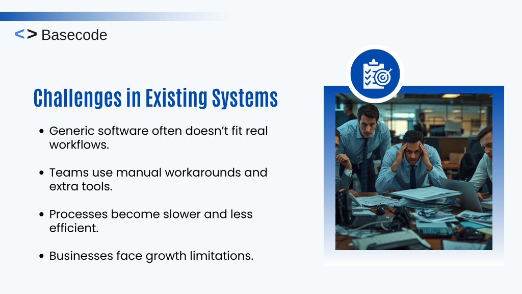 3. <> Basecode Challenges in Existing Systems Generic software often doesn’t fit real workflows. Teams use manual workarounds and extra tools. Processes become slower and less efficient. Businesses face growth limitations.