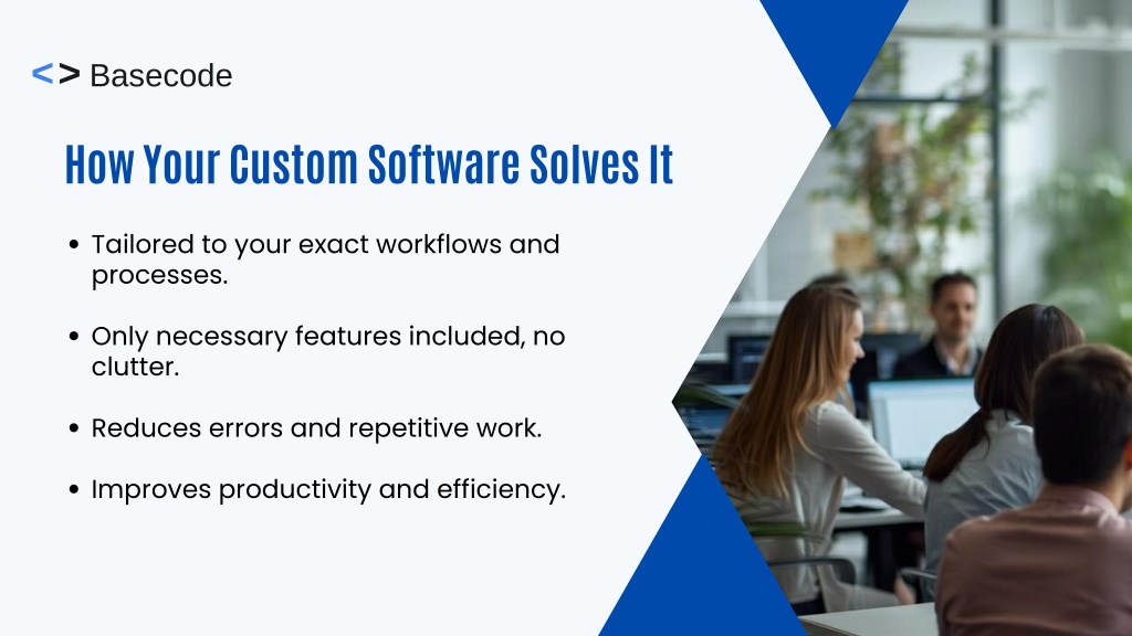 4. <> Basecode How Your Custom Software Solves It Tailored to your exact workflows and processes. Only necessary features included, no clutter. Reduces errors and repetitive work. Improves productivity and efficiency.
