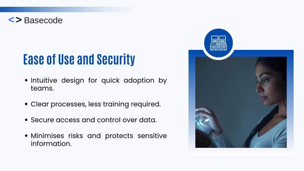6. <> Basecode Ease of Use and Security Intuitive design for quick adoption by teams. Clear processes, less training required. Secure access and control over data. Minimises risks and protects sensitive information.