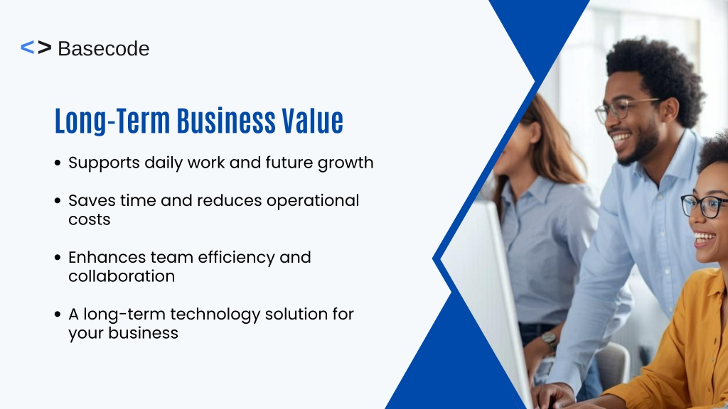 7. <> Basecode Long-Term Business Value Supports daily work and future growth Saves time and reduces operational costs Enhances team efficiency and collaboration A long-term technology solution for your business