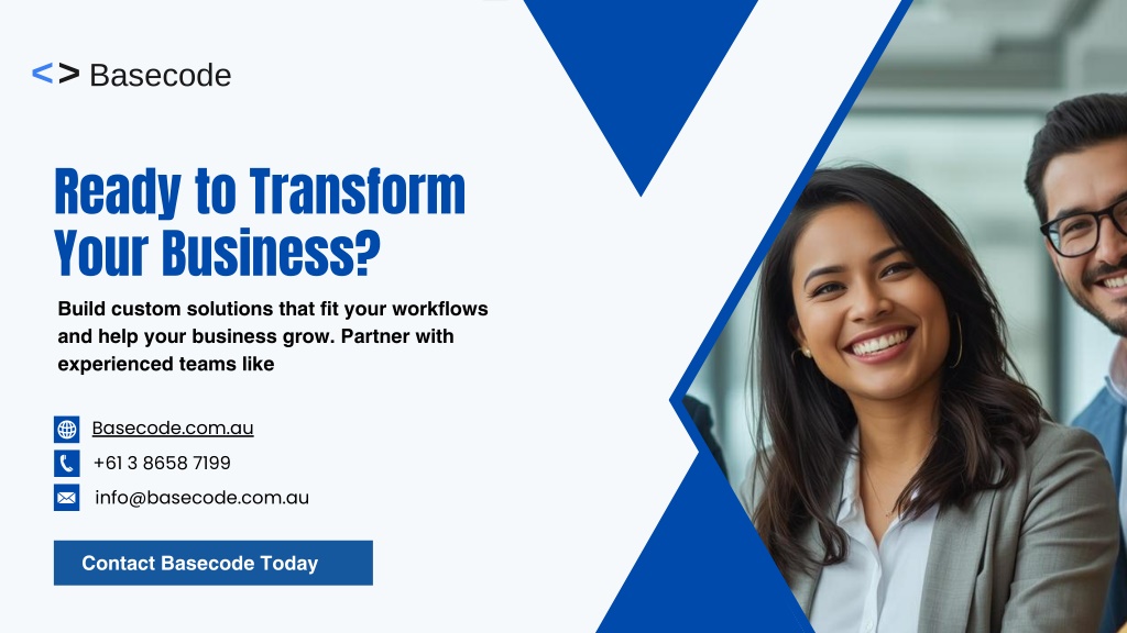 8. <> Basecode Ready to Transform Your Business? Build custom solutions that fit your workflows and help your business grow. Partner with experienced teams like Basecode.com.au +61 3 8658 7199 info@basecode.com.au Contact Basecode Today