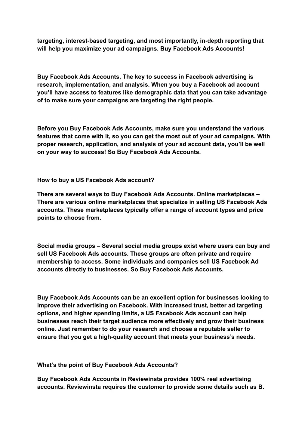 targeting, interest-based targeting, and most importantly, in-depth reporting that will help you maximize your ad campaigns. Buy Facebook Ads Accounts! Buy Facebook Ads Accounts, The key to success in Facebook advertising is research, implementation, and analysis. When you buy a Facebook ad account you’ll have access to features like demographic data that you can take advantage of to make sure your campaigns are targeting the right people. Before you Buy Facebook Ads Accounts, make sure you understand the various features that come with it, so you can get the most out of your ad campaigns. With proper research, application, and analysis of your ad account data, you’ll be well on your way to success! So Buy Facebook Ads Accounts. How to buy a US Facebook Ads account? There are several ways to Buy Facebook Ads Accounts. Online marketplaces – There are various online marketplaces that specialize in selling US Facebook Ads accounts. These marketplaces typically offer a range of account types and price points to choose from. Social media groups – Several social media groups exist where users can buy and sell US Facebook Ads accounts. These groups are often private and require membership to access. Some individuals and companies sell US Facebook Ad accounts directly to businesses. So Buy Facebook Ads Accounts. Buy Facebook Ads Accounts can be an excellent option for businesses looking to improve their advertising on Facebook. With increased trust, better ad targeting options, and higher spending limits, a US Facebook Ads account can help businesses reach their target audience more effectively and grow their business online. Just remember to do your research and choose a reputable seller to ensure that you get a high-quality account that meets your business’s needs. What’s the point of Buy Facebook Ads Accounts? Buy Facebook Ads Accounts in Reviewinsta provides 100% real advertising accounts. Reviewinsta requires the customer to provide some details such as B.