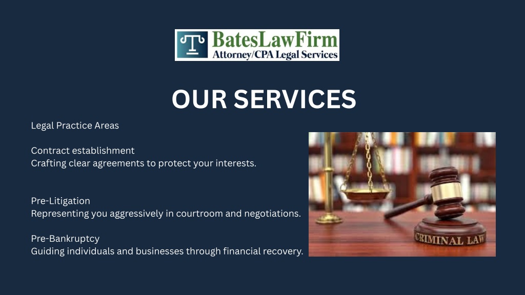 OUR SERVICES Legal Practice Areas Contract establishment Crafting clear agreements to protect your interests. Pre-Litigation Representing you aggressively in courtroom and negotiations. Pre-Bankruptcy Guiding individuals and businesses through financial recovery.