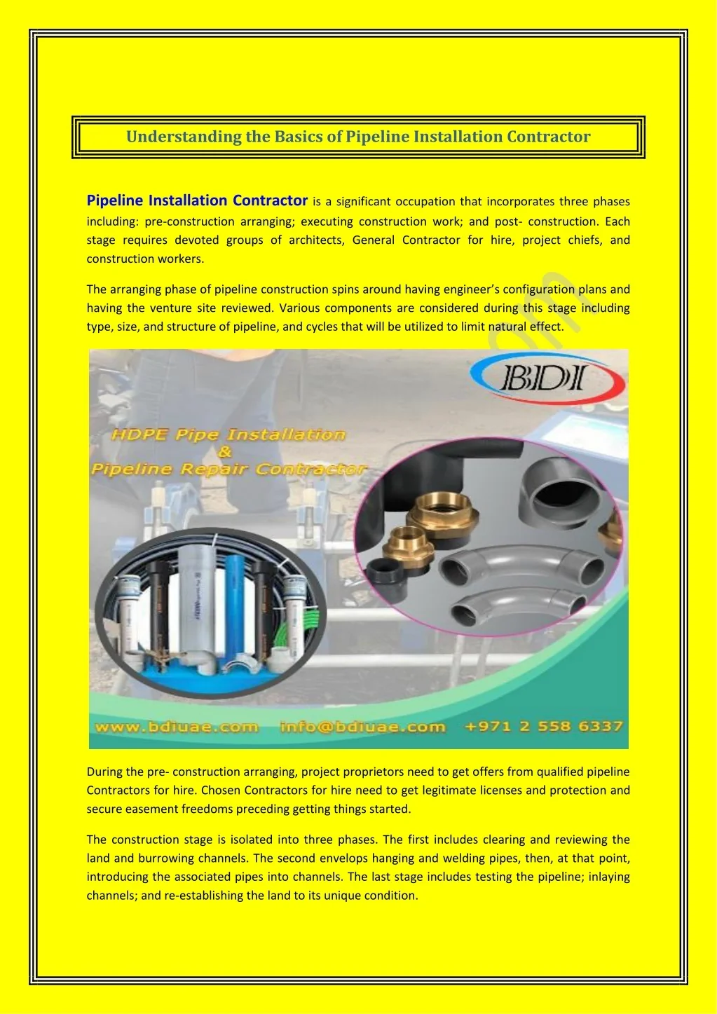 HDPE Pipe Welding Company utilizes the technique for subsurface utility designing to find the position and profundity of recently introduced lines and utilities. Having the option to decide the area of existing pipeline assists project Contractors with keeping away from project delays, limit construction costs, and give a more secure workplace. Construction groups need to clear and grade the site to give an option to proceed to digging systems. Fragments of line are delivered to the site through semi trucks. Group individuals then, at that point, string the lines together on the ground and welders need to weld pipes before they are set into channels. One of the additional difficult errands is bringing down pipes into channels. This work expects administrators to be exceptionally talented to unequivocally put pipes into position. The kind of testing pipes go through depends on the application being utilized. Sewer pipes and fire line persevere through various types of tests than flammable gas or oil pipelines. Construction and lines are likely to visit examinations during the Construction stage. Reviewers additionally approve that pipeline Contractors for hire hold fitting grants, licenses, and protection strategies and have authoritative archives relating to easement arrangements and landowner freedoms. Pipeline Installation Contractor regularly includes planning the undertaking with a few Contractors for hire. Modern and civil positions ordinarily require many Construction labourers to finish the work. It is basic to recruit HDPE Pipe Installation Company that have insight with the particular kind of establishment and fit for planning their work with different Contractor for hire. Pipeline projects are arranged as one or the other wet or dry utility. Albeit a couple of Contractor for hire are knowledgeable about the two fields, most represent considerable authority in one region or the other. Dry utility Pipeline Installation Contractor includes introducing pipes that pass on gaseous petrol or secure utilities, like broadcast communications and electrical, from ecological components. Bright Deal International is a leading company to provide contracts for all kinds of HDPE Pipes & Fittings and PVC High-Pressure Pipes & Fittings in UAE, Kuwait, Oman, Bahrain, and Saudi Arabia. Bright Deal International is a leading company to provide:- HDPE Pipe Fittings Supplier & Installation Contractor ADDC Pipeline Relocation & Pipeline Installation Contractor HDPE Pipe Welding & Machines Supplier, Rental Services Butt Fusion Welding Machines For more information, please visit our website: www.bdiuae.com & Call us now: +971 2 558 6337