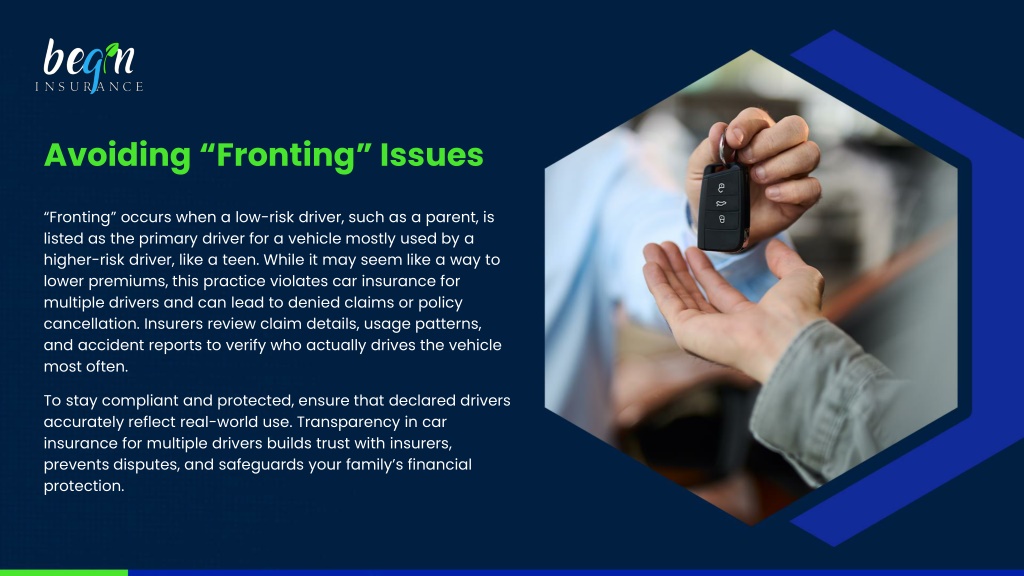 6. Avoiding “Fronting” Issues “Fronting” occurs when a low-risk driver, such as a parent, is listed as the primary driver for a vehicle mostly used by a higher-risk driver, like a teen. While it may seem like a way to lower premiums, this practice violates car insurance for multiple drivers and can lead to denied claims or policy cancellation. Insurers review claim details, usage patterns, and accident reports to verify who actually drives the vehicle most often. To stay compliant and protected, ensure that declared drivers accurately reflect real-world use. Transparency in car insurance for multiple drivers builds trust with insurers, prevents disputes, and safeguards your family’s financial protection.