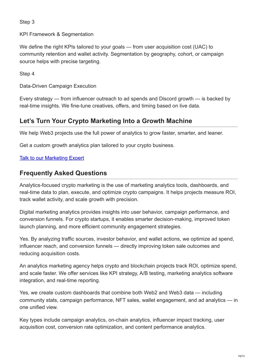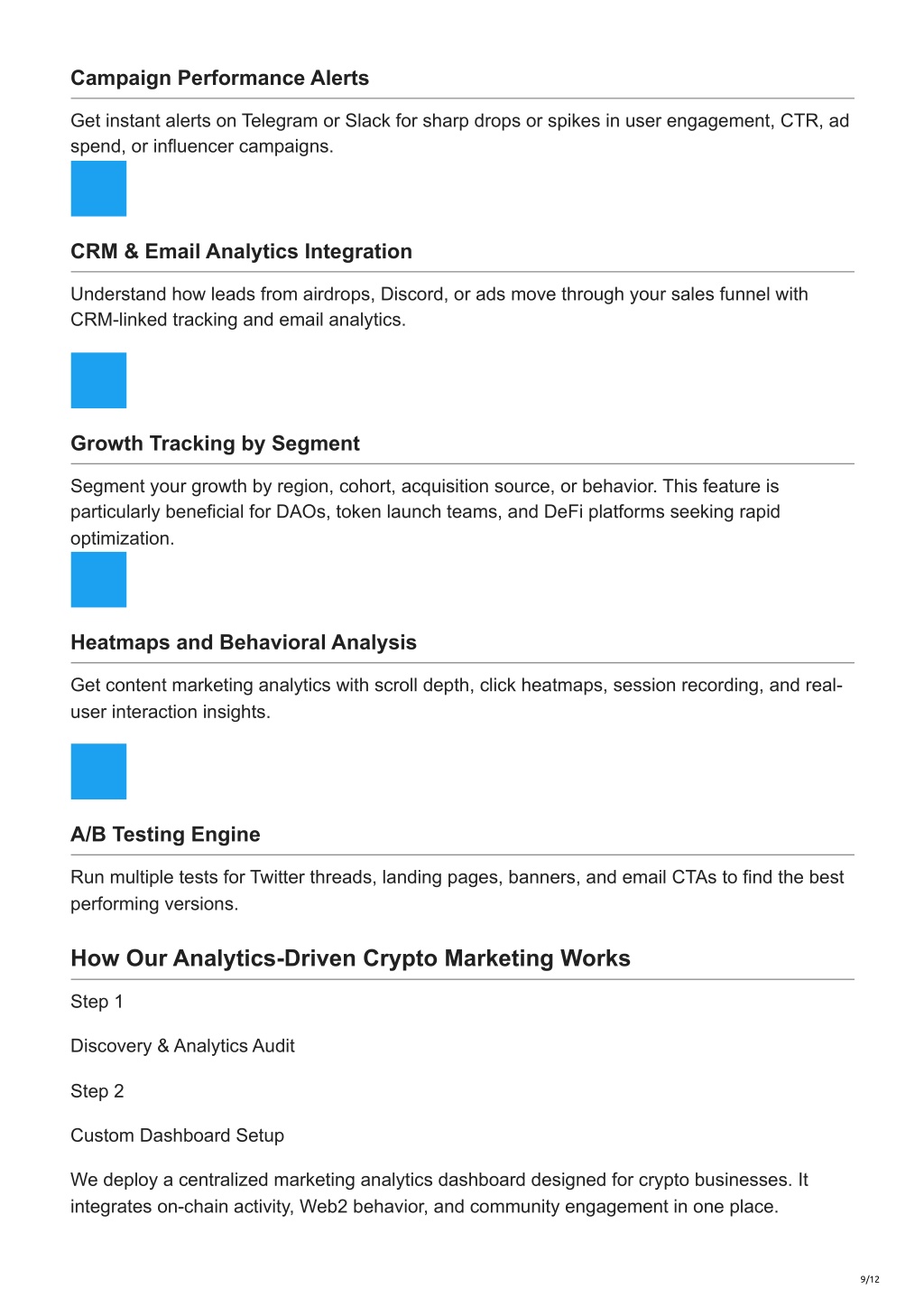 9. Campaign Performance Alerts Get instant alerts on Telegram or Slack for sharp drops or spikes in user engagement, CTR, ad spend, or influencer campaigns. CRM & Email Analytics Integration Understand how leads from airdrops, Discord, or ads move through your sales funnel with CRM-linked tracking and email analytics. Growth Tracking by Segment Segment your growth by region, cohort, acquisition source, or behavior. This feature is particularly beneficial for DAOs, token launch teams, and DeFi platforms seeking rapid optimization. Heatmaps and Behavioral Analysis Get content marketing analytics with scroll depth, click heatmaps, session recording, and real- user interaction insights. A/B Testing Engine Run multiple tests for Twitter threads, landing pages, banners, and email CTAs to find the best performing versions. How Our Analytics-Driven Crypto Marketing Works Step 1 Discovery & Analytics Audit Step 2 Custom Dashboard Setup We deploy a centralized marketing analytics dashboard designed for crypto businesses. It integrates on-chain activity, Web2 behavior, and community engagement in one place. 9/12