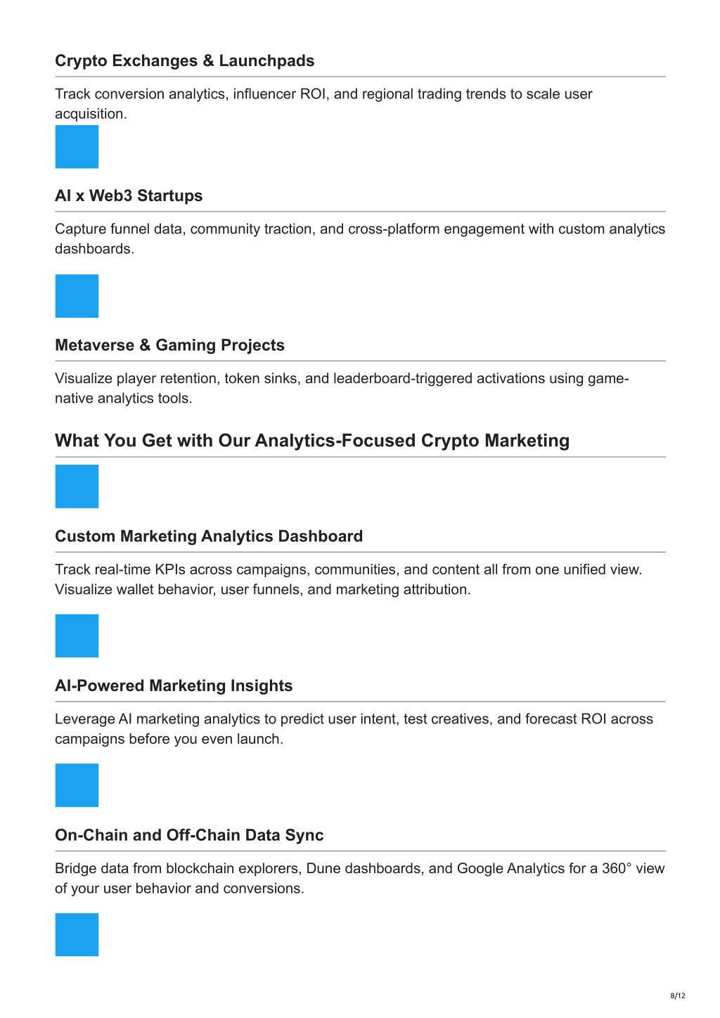 8. Crypto Exchanges & Launchpads Track conversion analytics, influencer ROI, and regional trading trends to scale user acquisition. AI x Web3 Startups Capture funnel data, community traction, and cross-platform engagement with custom analytics dashboards. Metaverse & Gaming Projects Visualize player retention, token sinks, and leaderboard-triggered activations using game- native analytics tools. What You Get with Our Analytics-Focused Crypto Marketing Custom Marketing Analytics Dashboard Track real-time KPIs across campaigns, communities, and content all from one unified view. Visualize wallet behavior, user funnels, and marketing attribution. AI-Powered Marketing Insights Leverage AI marketing analytics to predict user intent, test creatives, and forecast ROI across campaigns before you even launch. On-Chain and Off-Chain Data Sync Bridge data from blockchain explorers, Dune dashboards, and Google Analytics for a 360° view of your user behavior and conversions. 8/12