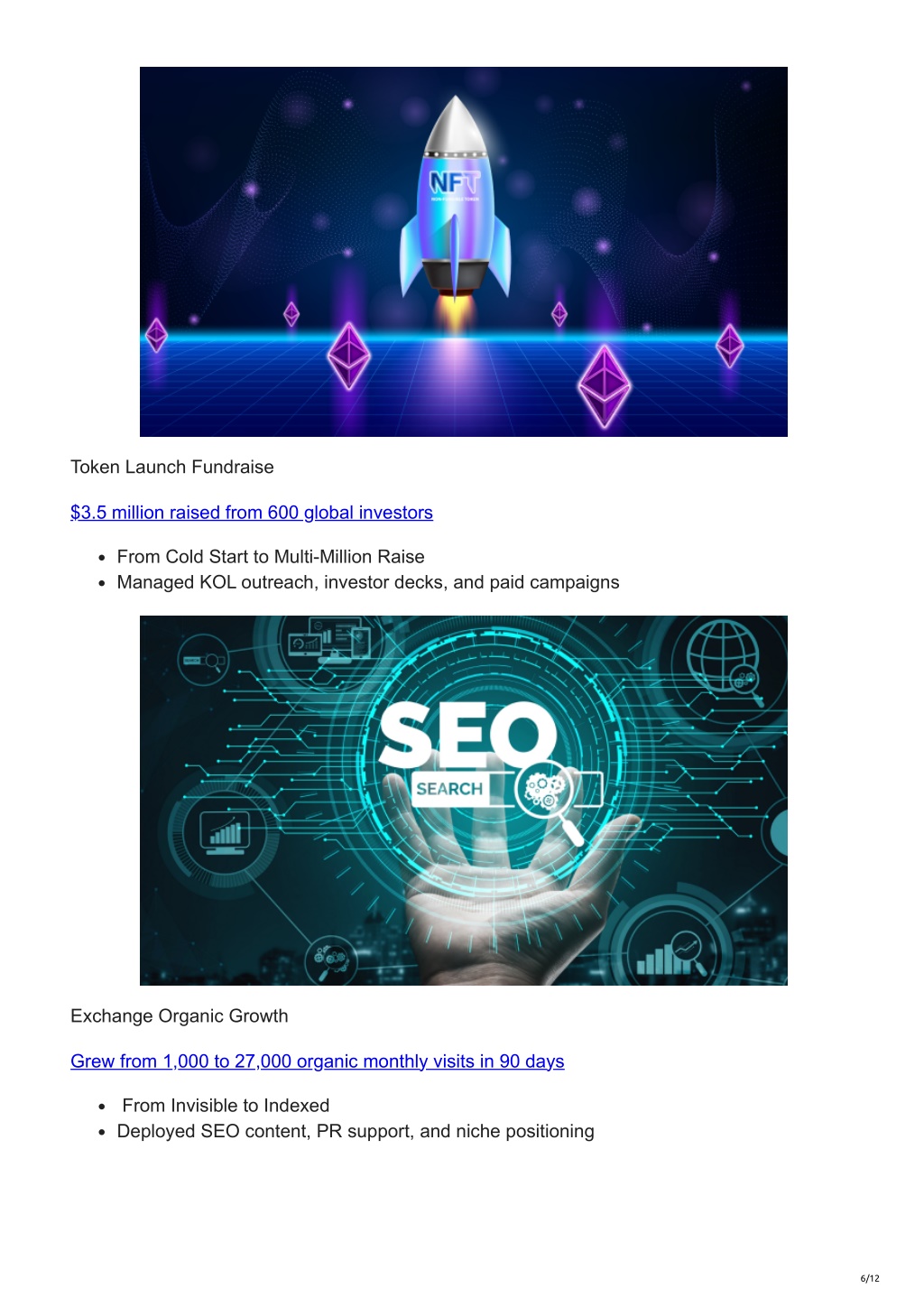 6. Token Launch Fundraise $3.5 million raised from 600 global investors From Cold Start to Multi-Million Raise Managed KOL outreach, investor decks, and paid campaigns Exchange Organic Growth Grew from 1,000 to 27,000 organic monthly visits in 90 days From Invisible to Indexed Deployed SEO content, PR support, and niche positioning 6/12