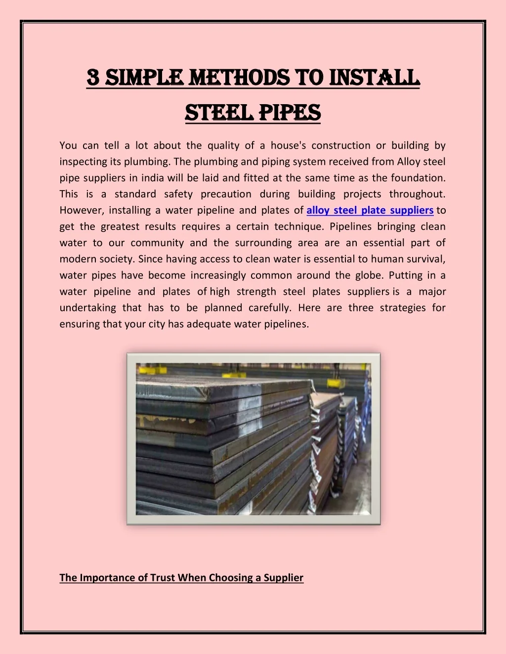 3 Simple Methods to Install 3 Simple Methods to Install Steel Pipes Steel Pipes You can tell a lot about the quality of a house's construction or building by inspecting its plumbing. The plumbing and piping system received from Alloy steel pipe suppliers in india will be laid and fitted at the same time as the foundation. This is a standard safety precaution during building projects throughout. However, installing a water pipeline and plates of alloy steel plate suppliers to get the greatest results requires a certain technique. Pipelines bringing clean water to our community and the surrounding area are an essential part of modern society. Since having access to clean water is essential to human survival, water pipes have become increasingly common around the globe. Putting in a water pipeline and plates of high strength steel plates suppliers is a major undertaking that has to be planned carefully. Here are three strategies for ensuring that your city has adequate water pipelines. The Importance of Trust When Choosing a Supplier