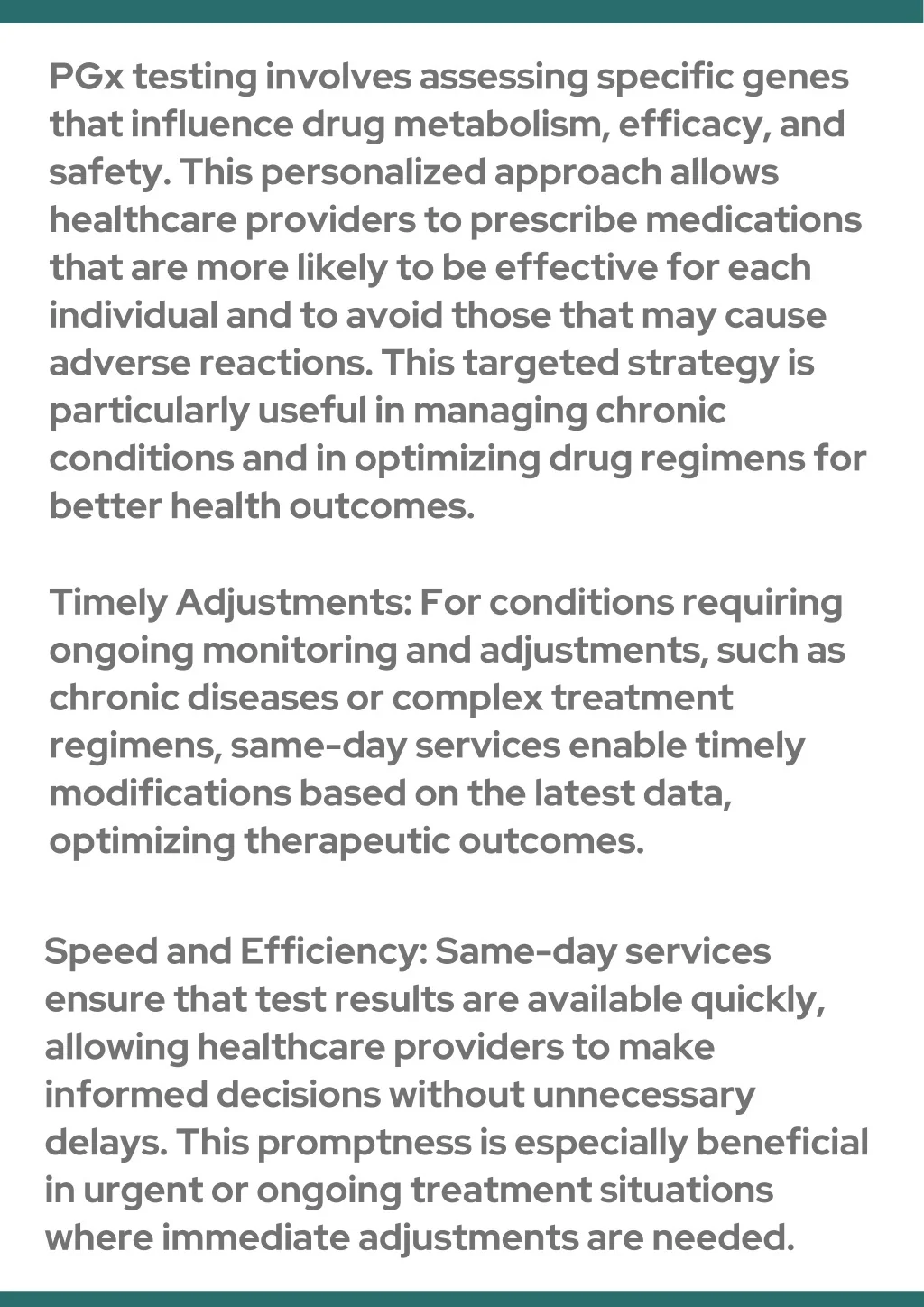 PGx testing involves assessing specific genes that influence drug metabolism, efficacy, and safety. This personalized approach allows healthcare providers to prescribe medications that are more likely to be effective for each individual and to avoid those that may cause adverse reactions. This targeted strategy is particularly useful in managing chronic conditions and in optimizing drug regimens for better health outcomes. Timely Adjustments: For conditions requiring ongoing monitoring and adjustments, such as chronic diseases or complex treatment regimens, same-day services enable timely modifications based on the latest data, optimizing therapeutic outcomes. Speed and Efficiency: Same-day services ensure that test results are available quickly, allowing healthcare providers to make informed decisions without unnecessary delays. This promptness is especially beneficial in urgent or ongoing treatment situations where immediate adjustments are needed.