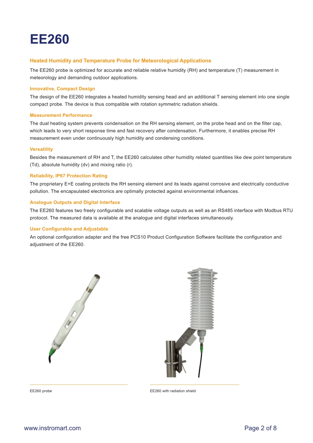 The EE260 probe is optimized for accurate and reliable relative humidity (RH) and temperature (T) measurement in meteorology and demanding outdoor applications. It features a compact design with a heated humidity sensing head and an integrated temperature sensor, ensuring compatibility with radiation shields and reliable performance in harsh environments.