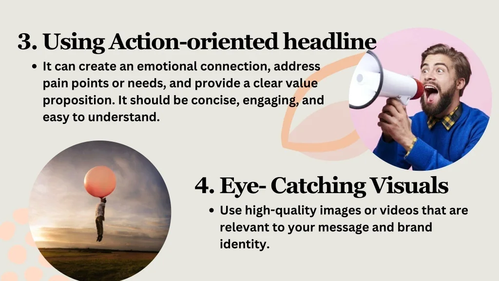 3. Using Action-oriented headline It can create an emotional connection, address pain points or needs, and provide a clear value proposition. It should be concise, engaging, and easy to understand. 4. Eye- Catching Visuals Use high-quality images or videos that are relevant to your message and brand identity.