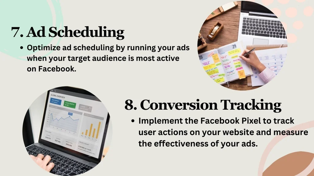 7. Ad Scheduling Optimize ad scheduling by running your ads when your target audience is most active on Facebook. 8. Conversion Tracking Implement the Facebook Pixel to track user actions on your website and measure the effectiveness of your ads.