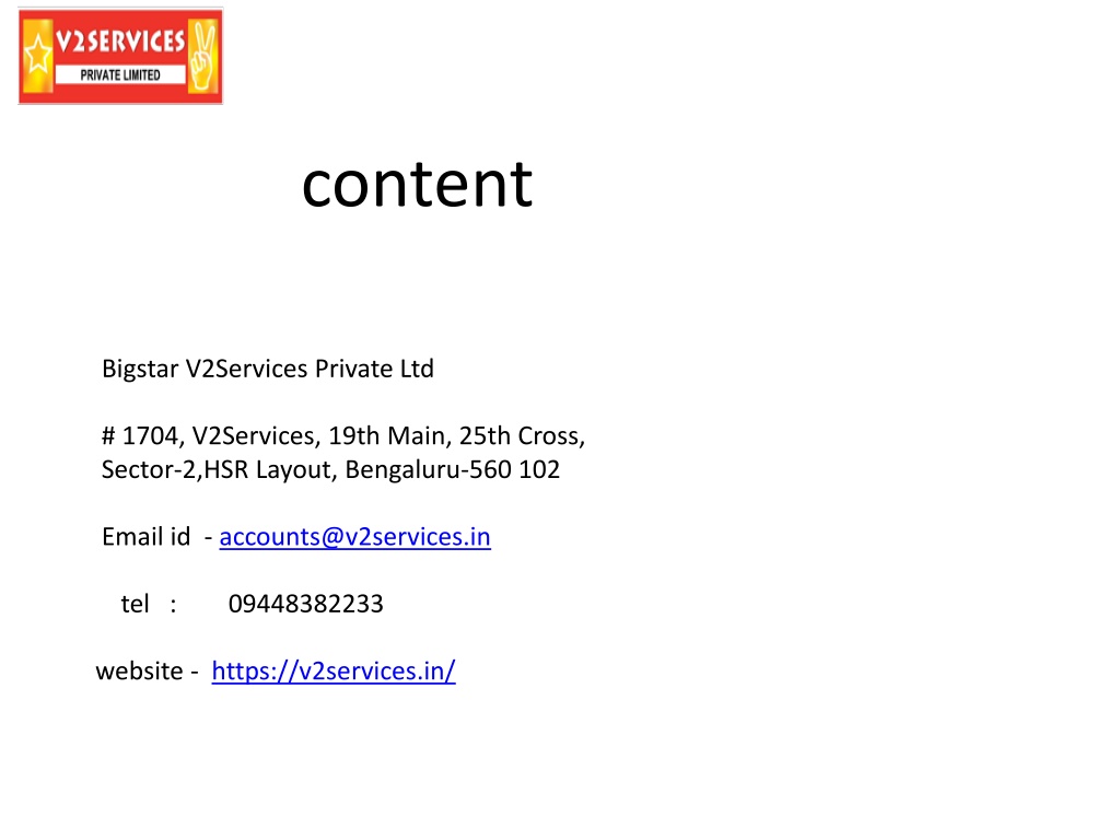 3. content Bigstar V2Services Private Ltd # 1704, V2Services, 19th Main, 25th Cross, Sector-2,HSR Layout, Bengaluru-560 102 Email id - accounts@v2services.in tel : 09448382233 website - https://v2services.in/