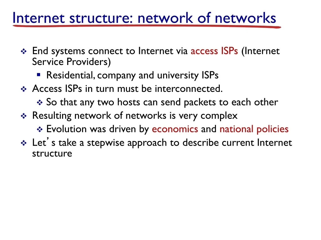 Internet structure: network of networks • End systems connect to Internet via access ISPs (Internet Service Providers) • Residential, company and university ISPs • Access ISPs in turn must be interconnected. • So that any two hosts can send packets to each other • Resulting network of networks is very complex • Evolution was driven by economics and national policies • Let’s take a stepwise approach to describe current Internet structure