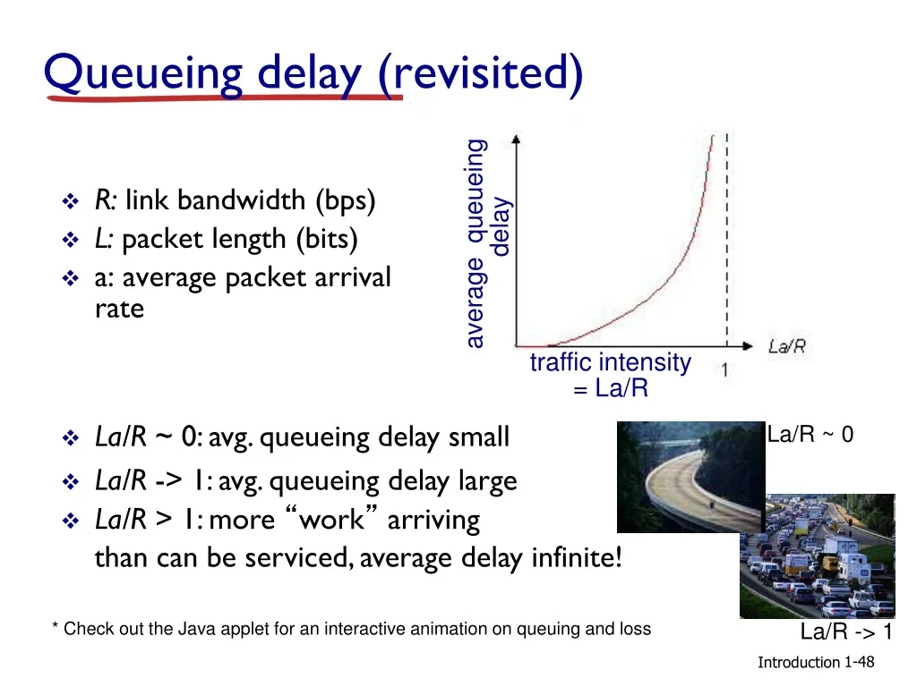 R: link bandwidth (bps) L: packet length (bits) a: average packet arrival rate Queueing delay (revisited) average queueing delay traffic intensity = La/R • La/R ~ 0: avg. queueing delay small • La/R -> 1: avg. queueing delay large • La/R > 1: more “work” arriving than can be serviced, average delay infinite! La/R ~ 0 La/R -> 1 * Check out the Java applet for an interactive animation on queuing and loss Introduction