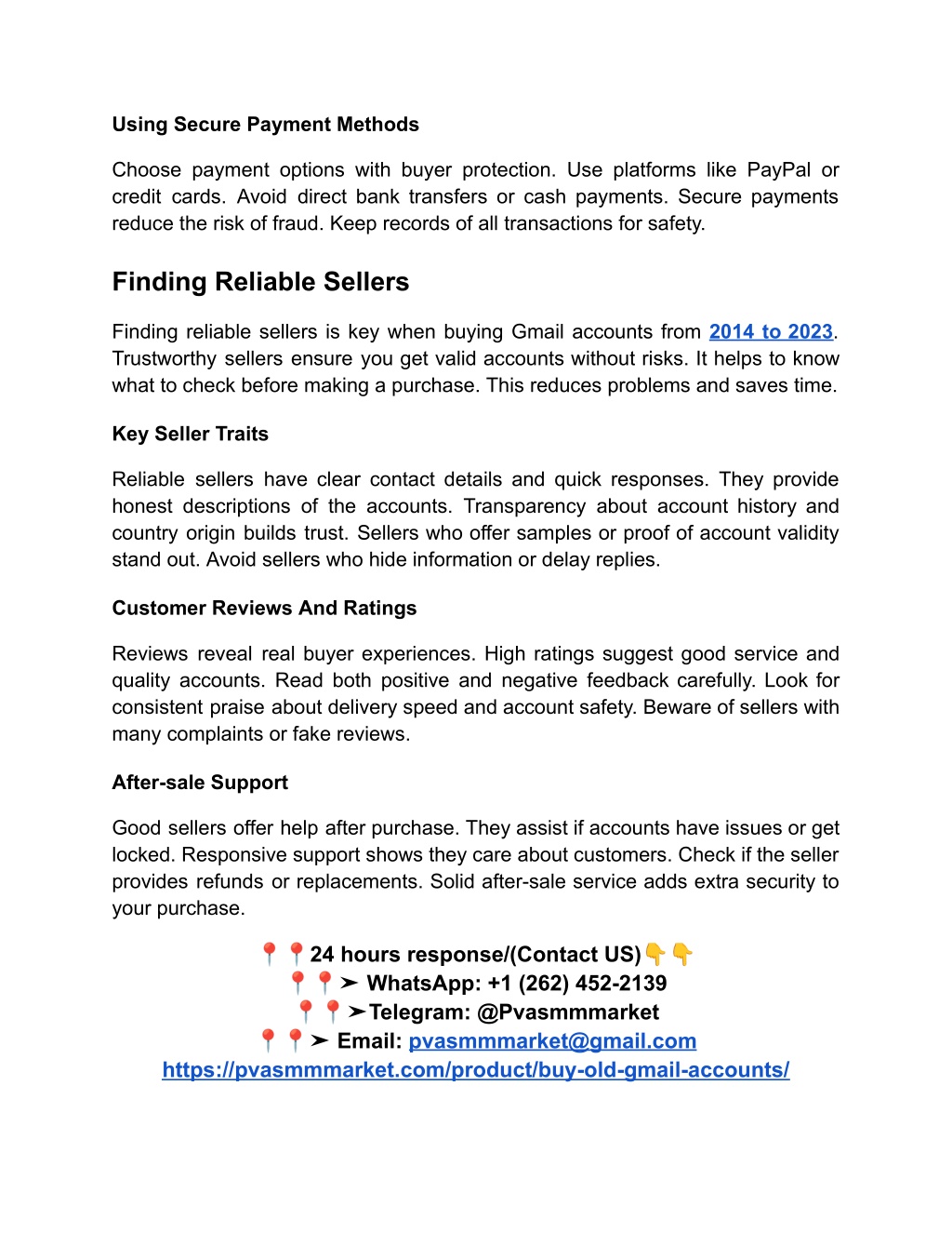 Using Secure Payment Methods Choose payment options with buyer protection. Use platforms like PayPal or credit cards. Avoid direct bank transfers or cash payments. Secure payments reduce the risk of fraud. Keep records of all transactions for safety. Finding Reliable Sellers Finding reliable sellers is key when buying Gmail accounts from 2014 to 2023. Trustworthy sellers ensure you get valid accounts without risks. It helps to know what to check before making a purchase. This reduces problems and saves time. Key Seller Traits Reliable sellers have clear contact details and quick responses. They provide honest descriptions of the accounts. Transparency about account history and country origin builds trust. Sellers who offer samples or proof of account validity stand out. Avoid sellers who hide information or delay replies. Customer Reviews And Ratings Reviews reveal real buyer experiences. High ratings suggest good service and quality accounts. Read both positive and negative feedback carefully. Look for consistent praise about delivery speed and account safety. Beware of sellers with many complaints or fake reviews. After-sale Support Good sellers offer help after purchase. They assist if accounts have issues or get locked. Responsive support shows they care about customers. Check if the seller provides refunds or replacements. Solid after-sale service adds extra security to your purchase. ??24 hours response/(Contact US)?? ??➤ WhatsApp: +1 (262) 452-2139 ??➤Telegram: @Pvasmmmarket ??➤ Email: pvasmmmarket@gmail.com https://pvasmmmarket.com/product/buy-old-gmail-accounts/