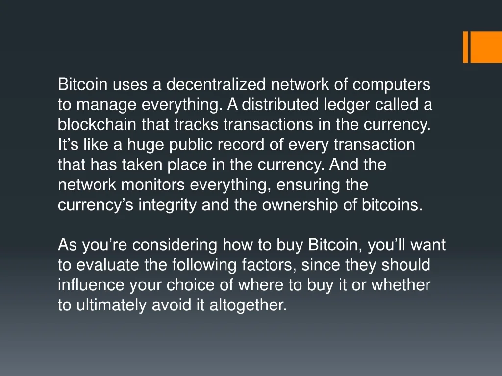 Bitcoin uses a decentralized network of computers to manage everything. A distributed ledger called a blockchain that tracks transactions in the currency. It’s like a huge public record of every transaction that has taken place in the currency. And the network monitors everything, ensuring the currency’s integrity and the ownership of bitcoins.As you’re considering how to buy Bitcoin, you’ll want to evaluate the following factors, since they should influence your choice of where to buy it or whether to ultimately avoid it altogether.