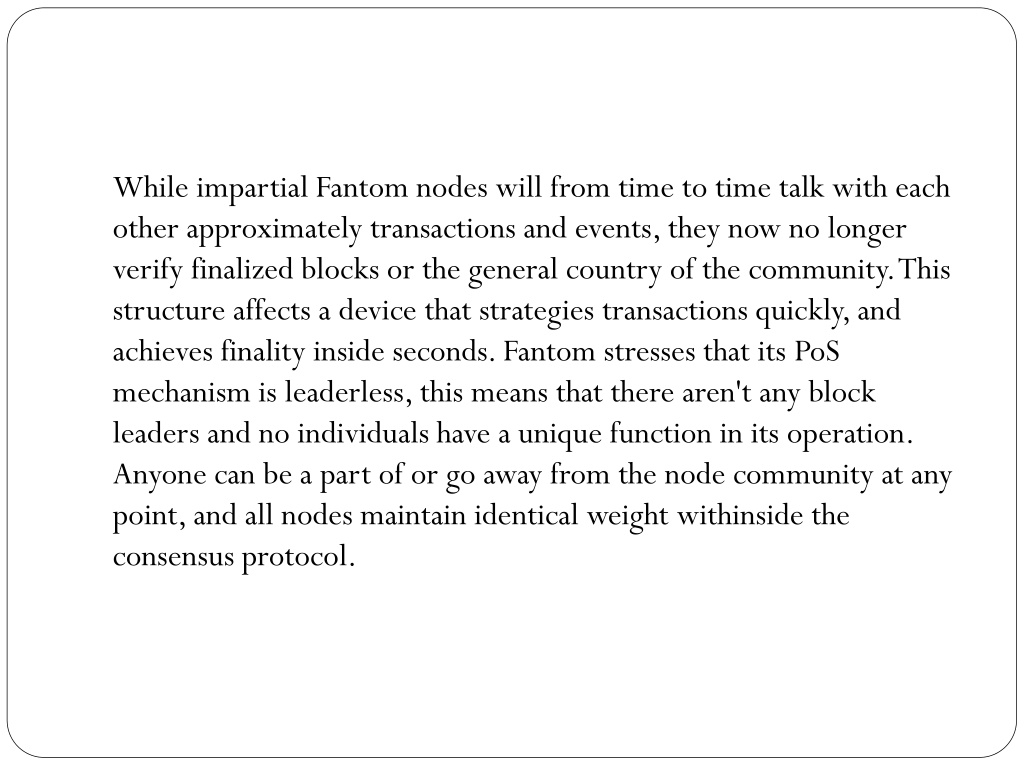 While impartial Fantom nodes will from time to time talk with each other approximately transactions and events, they now no longer verify finalized blocks or the general country of the community. This structure affects a device that strategies transactions quickly, and achieves finality inside seconds. Fantom stresses that its PoS mechanism is leaderless, this means that there aren't any block leaders and no individuals have a unique function in its operation. Anyone can be a part of or go away from the node community at any point, and all nodes maintain identical weight withinside the consensus protocol.