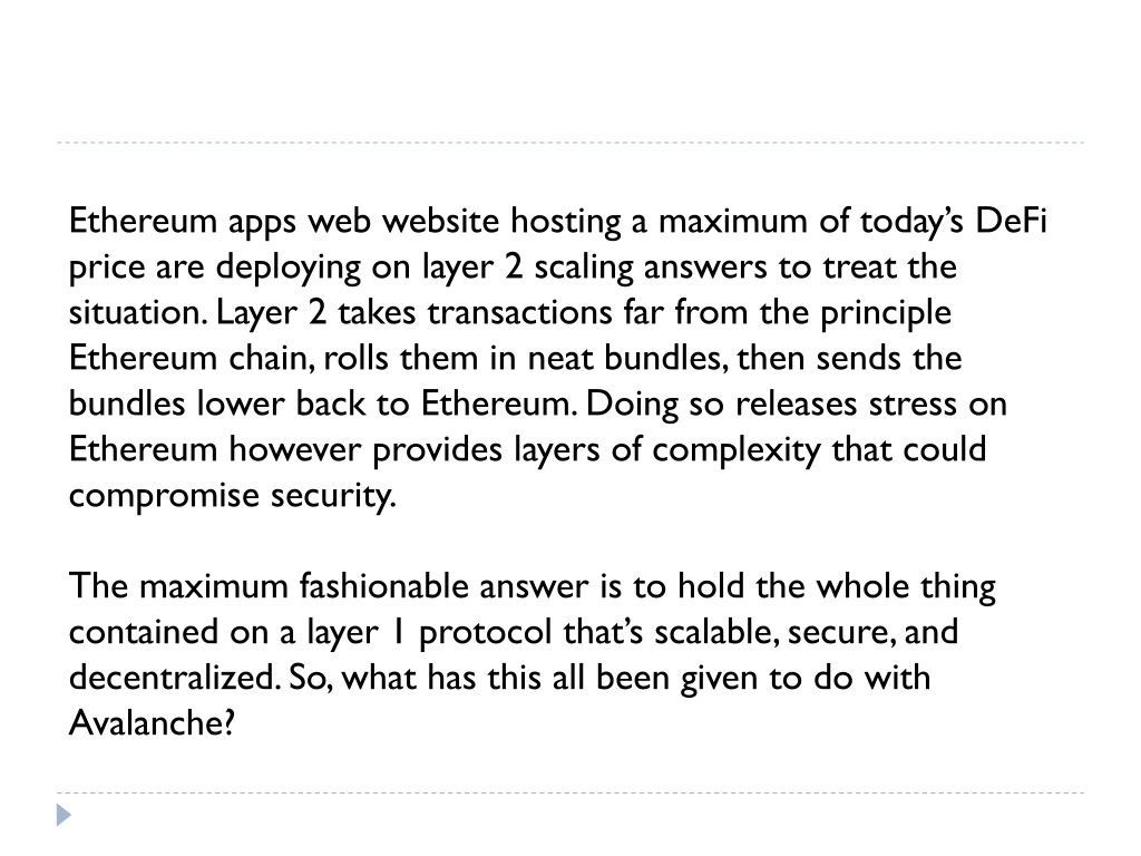 Ethereum apps web website hosting a maximum of today’s DeFi price are deploying on layer 2 scaling answers to treat the situation. Layer 2 takes transactions far from the principle Ethereum chain, rolls them in neat bundles, then sends the bundles lower back to Ethereum. Doing so releases stress on Ethereum however provides layers of complexity that could compromise security.The maximum fashionable answer is to hold the whole thing contained on a layer 1 protocol that’s scalable, secure, and decentralized. So, what has this all been given to do with Avalanche?