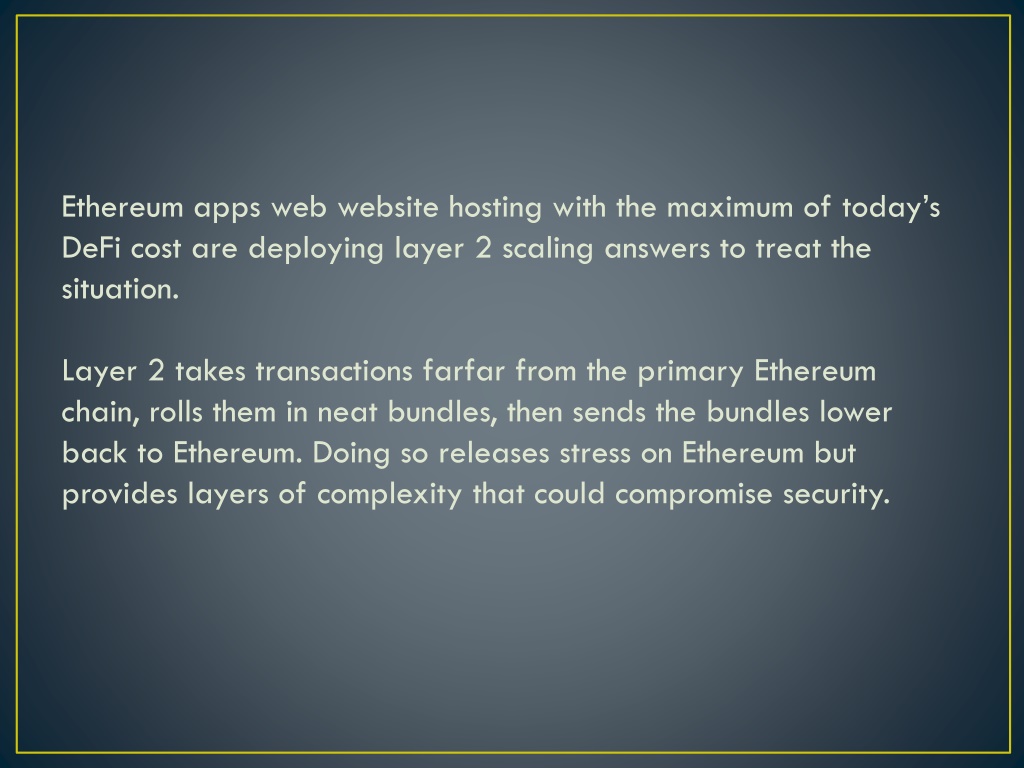 Ethereum apps web website hosting with the maximum of today’s DeFi cost are deploying layer 2 scaling answers to treat the situation.Layer 2 takes transactions farfar from the primary Ethereum chain, rolls them in neat bundles, then sends the bundles lower back to Ethereum. Doing so releases stress on Ethereum but provides layers of complexity that could compromise security.