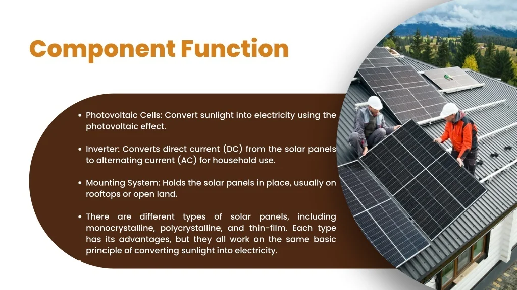 Component Function Photovoltaic Cells: Convert sunlight into electricity using the photovoltaic effect. Inverter: Converts direct current (DC) from the solar panels to alternating current (AC) for household use. Mounting System: Holds the solar panels in place, usually on rooftops or open land. There are different types of solar panels, including monocrystalline, polycrystalline, and thin-film. Each type has its advantages, but they all work on the same basic principle of converting sunlight into electricity.