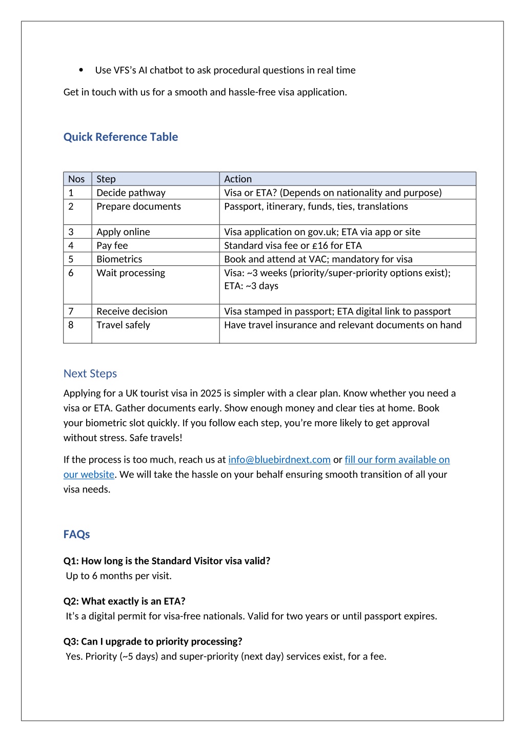 Use VFS’s AI chatbot to ask procedural questions in real time Get in touch with us for a smooth and hassle-free visa application. Quick Reference Table Nos 1 2 Step Decide pathway Prepare documents Action Visa or ETA? (Depends on nationality and purpose) Passport, itinerary, funds, ties, translations 3 4 5 6 Apply online Pay fee Biometrics Wait processing Visa application on gov.uk; ETA via app or site Standard visa fee or £16 for ETA Book and attend at VAC; mandatory for visa Visa: ~3 weeks (priority/super-priority options exist); ETA: ~3 days 7 8 Receive decision Travel safely Visa stamped in passport; ETA digital link to passport Have travel insurance and relevant documents on hand Next Steps Applying for a UK tourist visa in 2025 is simpler with a clear plan. Know whether you need a visa or ETA. Gather documents early. Show enough money and clear ties at home. Book your biometric slot quickly. If you follow each step, you’re more likely to get approval without stress. Safe travels! If the process is too much, reach us at info@bluebirdnext.com or fill our form available on our website. We will take the hassle on your behalf ensuring smooth transition of all your visa needs. FAQs Q1: How long is the Standard Visitor visa valid? Up to 6 months per visit. Q2: What exactly is an ETA? It’s a digital permit for visa-free nationals. Valid for two years or until passport expires. Q3: Can I upgrade to priority processing? Yes. Priority (~5 days) and super-priority (next day) services exist, for a fee.