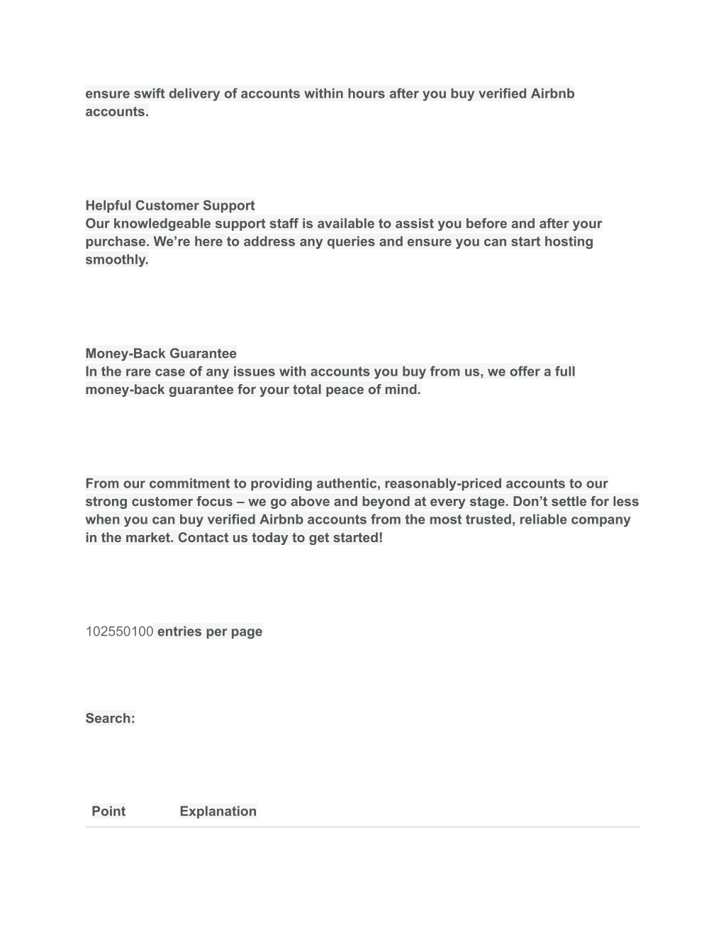 ensure swift delivery of accounts within hours after you buy verified Airbnb accounts. Helpful Customer Support Our knowledgeable support staff is available to assist you before and after your purchase. We’re here to address any queries and ensure you can start hosting smoothly. Money-Back Guarantee In the rare case of any issues with accounts you buy from us, we offer a full money-back guarantee for your total peace of mind. From our commitment to providing authentic, reasonably-priced accounts to our strong customer focus – we go above and beyond at every stage. Don’t settle for less when you can buy verified Airbnb accounts from the most trusted, reliable company in the market. Contact us today to get started! 102550100 entries per page Search: Point Explanation