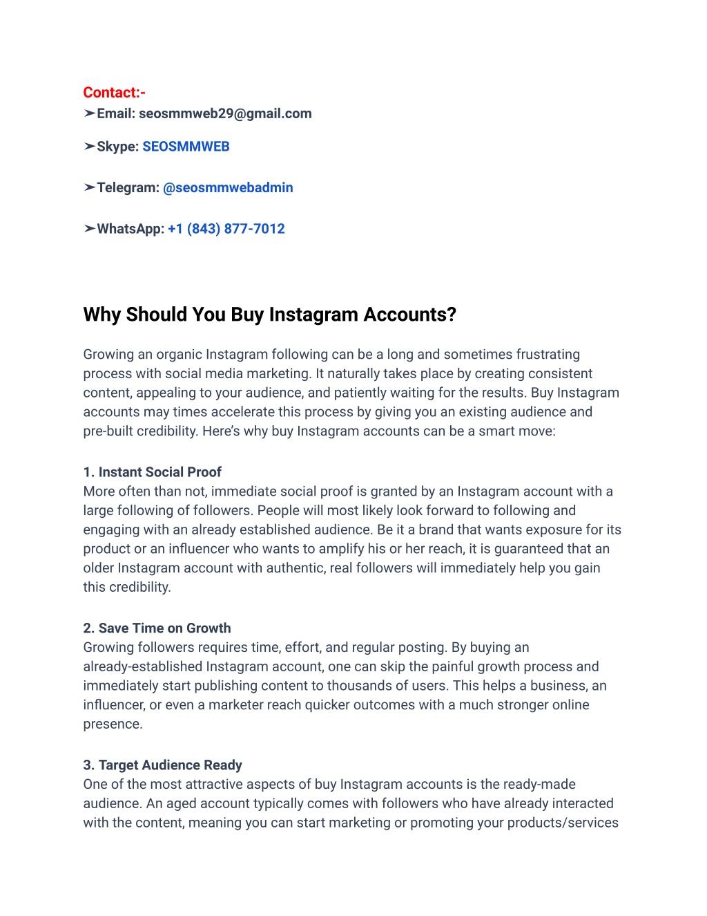 Contact:- ➤Email: seosmmweb29@gmail.com ➤Skype: SEOSMMWEB ➤Telegram: @seosmmwebadmin ➤WhatsApp: +1 (843) 877-7012 Why Should You Buy Instagram Accounts? Growing an organic Instagram following can be a long and sometimes frustrating process with social media marketing. It naturally takes place by creating consistent content, appealing to your audience, and patiently waiting for the results. Buy Instagram accounts may times accelerate this process by giving you an existing audience and pre-built credibility. Here’s why buy Instagram accounts can be a smart move: 1. Instant Social Proof More often than not, immediate social proof is granted by an Instagram account with a large following of followers. People will most likely look forward to following and engaging with an already established audience. Be it a brand that wants exposure for its product or an influencer who wants to amplify his or her reach, it is guaranteed that an older Instagram account with authentic, real followers will immediately help you gain this credibility. 2. Save Time on Growth Growing followers requires time, effort, and regular posting. By buying an already-established Instagram account, one can skip the painful growth process and immediately start publishing content to thousands of users. This helps a business, an influencer, or even a marketer reach quicker outcomes with a much stronger online presence. 3. Target Audience Ready One of the most attractive aspects of buy Instagram accounts is the ready-made audience. An aged account typically comes with followers who have already interacted with the content, meaning you can start marketing or promoting your products/services