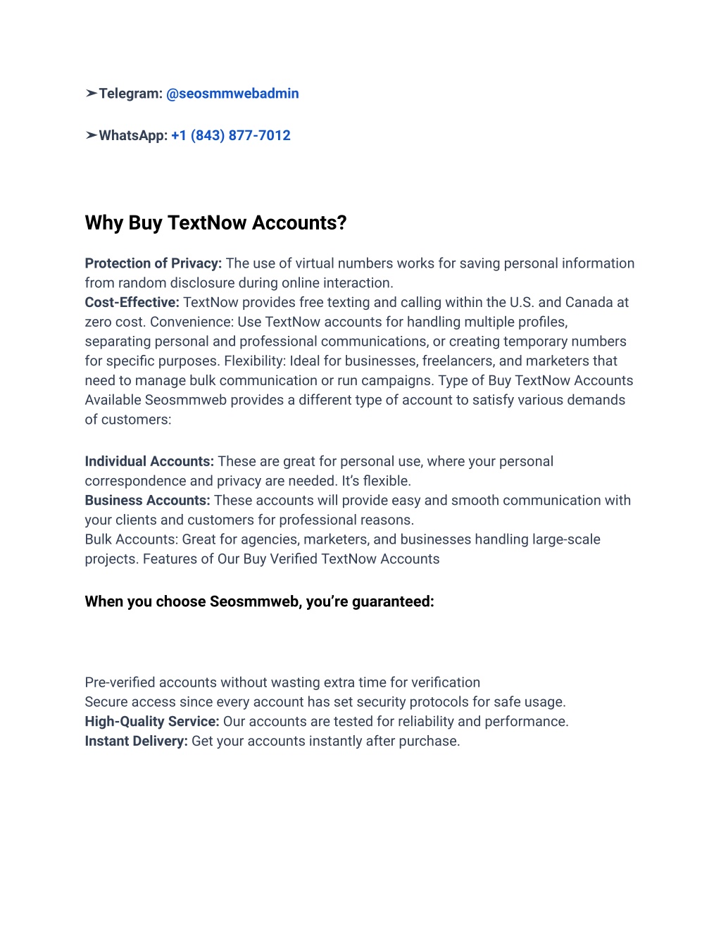 Contact:- ➤Email: seosmmweb29@gmail.com ➤Skype: SEOSMMWEB ➤Telegram: @seosmmwebadmin ➤WhatsApp: +1 (843) 877-7012 Benefits of Buy TextNow Accounts from Seosmmweb Reliability You Can Trust Seosmmweb is a trusted provider of high-quality digital solutions. When you buy TextNow accounts from us, you can be sure that you’re getting a product that will meet your expectations.