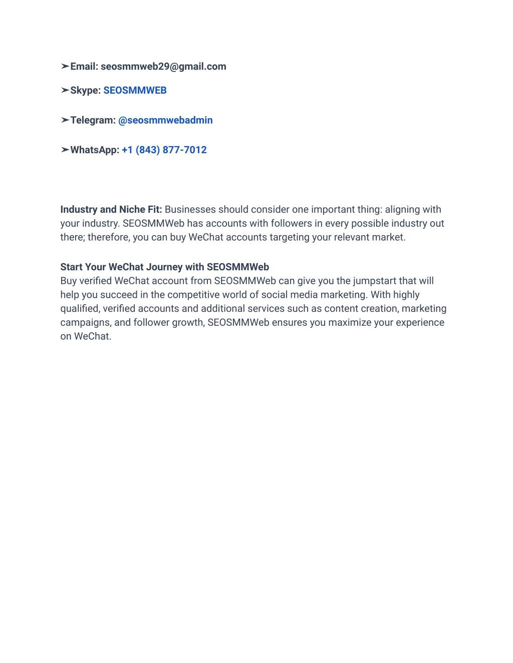 ➤Email: seosmmweb29@gmail.com ➤Skype: SEOSMMWEB ➤Telegram: @seosmmwebadmin ➤WhatsApp: +1 (843) 877-7012 Industry and Niche Fit: Businesses should consider one important thing: aligning with your industry. SEOSMMWeb has accounts with followers in every possible industry out there; therefore, you can buy WeChat accounts targeting your relevant market. Start Your WeChat Journey with SEOSMMWeb Buy verified WeChat account from SEOSMMWeb can give you the jumpstart that will help you succeed in the competitive world of social media marketing. With highly qualified, verified accounts and additional services such as content creation, marketing campaigns, and follower growth, SEOSMMWeb ensures you maximize your experience on WeChat.