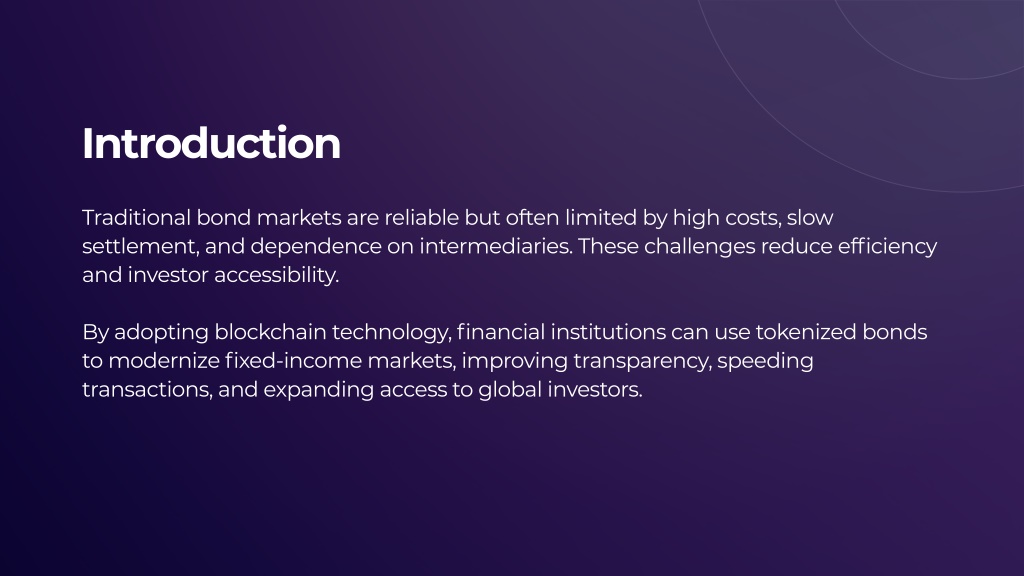 Introduction Traditional bond markets are reliable but often limited by high costs, slow settlement, and dependence on intermediaries. These challenges reduce efficiency and investor accessibility. By adopting blockchain technology, financial institutions can use tokenized bonds to modernize fixed-income markets, improving transparency, speeding transactions, and expanding access to global investors.