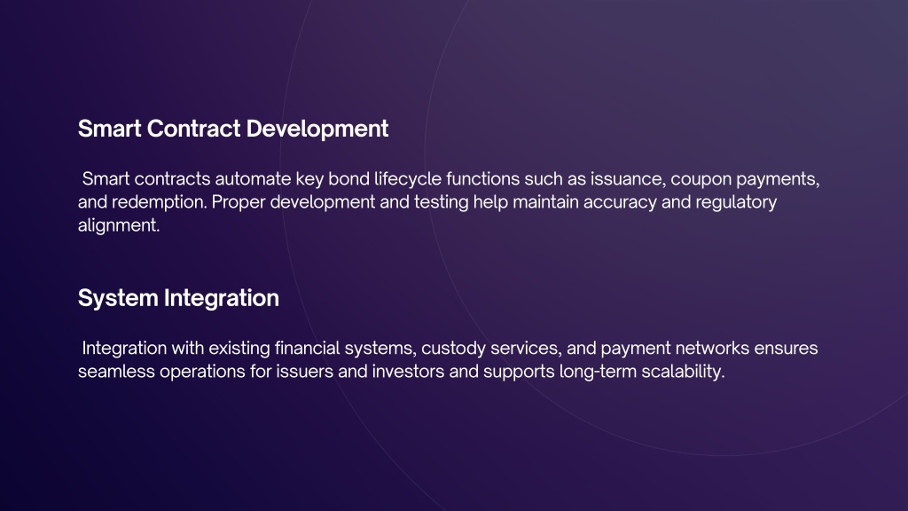 Smart Contract Development Smart contracts automate key bond lifecycle functions such as issuance, coupon payments, and redemption. Proper development and testing help maintain accuracy and regulatory alignment. System Integration Integration with existing financial systems, custody services, and payment networks ensures seamless operations for issuers and investors and supports long-term scalability.