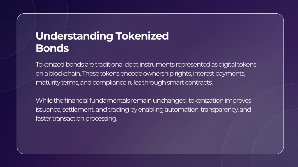 Understanding Tokenized Bonds Tokenized bonds are traditional debt instruments represented as digital tokens on a blockchain. These tokens encode ownership rights, interest payments, maturity terms, and compliance rules through smart contracts. While the financial fundamentals remain unchanged, tokenization improves issuance, settlement, and trading by enabling automation, transparency, and faster transaction processing.