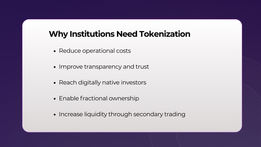 Why Institutions Need Tokenization Reduce operational costs Improve transparency and trust Reach digitally native investors Enable fractional ownership Increase liquidity through secondary trading
