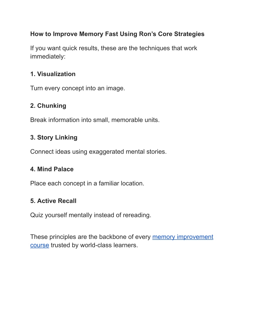 How to Improve Memory Fast Using Ron’s Core Strategies If you want quick results, these are the techniques that work immediately: 1. Visualization Turn every concept into an image. 2. Chunking Break information into small, memorable units. 3. Story Linking Connect ideas using exaggerated mental stories. 4. Mind Palace Place each concept in a familiar location. 5. Active Recall Quiz yourself mentally instead of rereading. These principles are the backbone of every memory improvement course trusted by world-class learners.