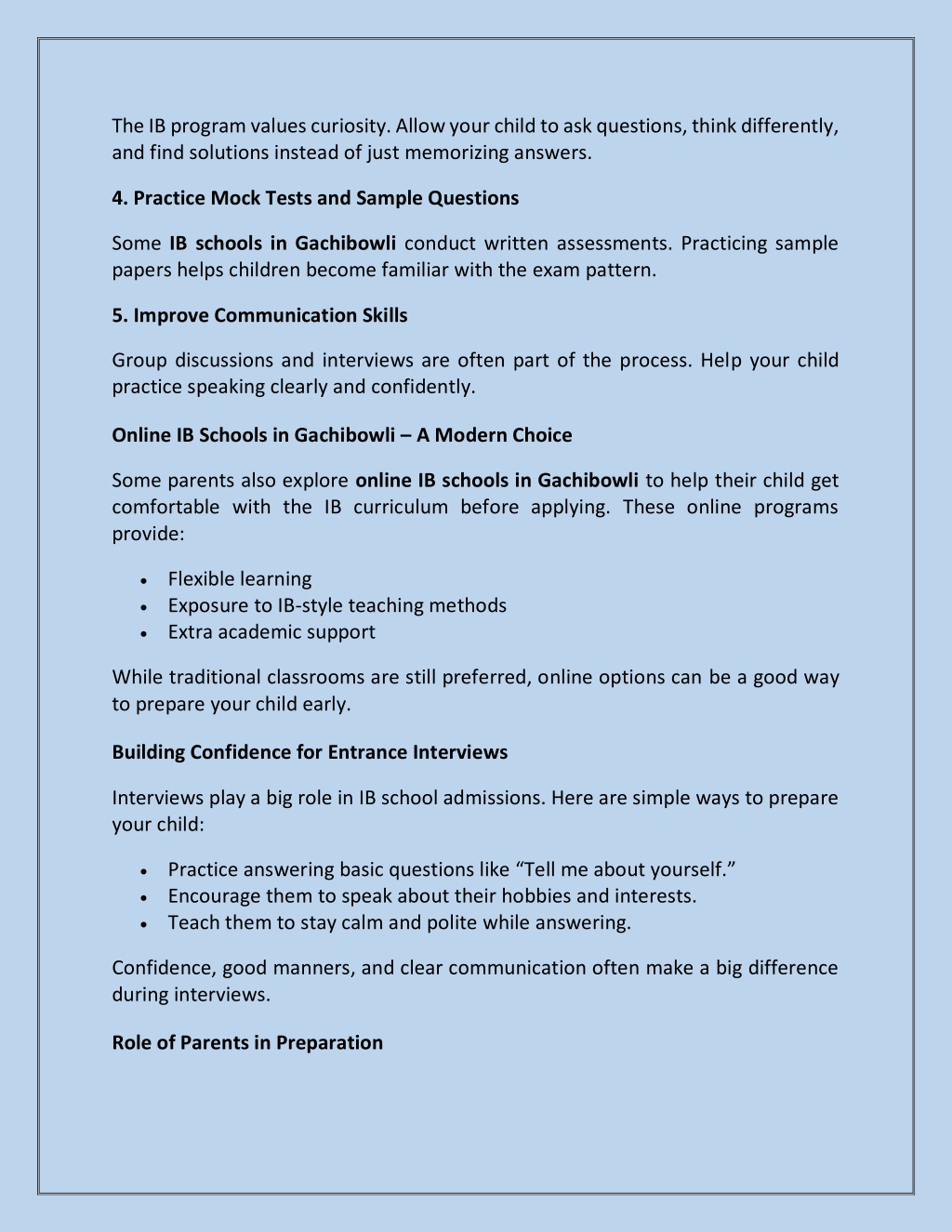 The IB program values curiosity. Allow your child to ask questions, think differently, and find solutions instead of just memorizing answers. 4. Practice Mock Tests and Sample Questions Some IB schools in Gachibowli conduct written assessments. Practicing sample papers helps children become familiar with the exam pattern. 5. Improve Communication Skills Group discussions and interviews are often part of the process. Help your child practice speaking clearly and confidently. Online IB Schools in Gachibowli – A Modern Choice Some parents also explore online IB schools in Gachibowli to help their child get comfortable with the IB curriculum before applying. These online programs provide: Flexible learning Exposure to IB-style teaching methods Extra academic support While traditional classrooms are still preferred, online options can be a good way to prepare your child early. Building Confidence for Entrance Interviews Interviews play a big role in IB school admissions. Here are simple ways to prepare your child: Practice answering basic questions like “Tell me about yourself.” Encourage them to speak about their hobbies and interests. Teach them to stay calm and polite while answering. Confidence, good manners, and clear communication often make a big difference during interviews. Role of Parents in Preparation