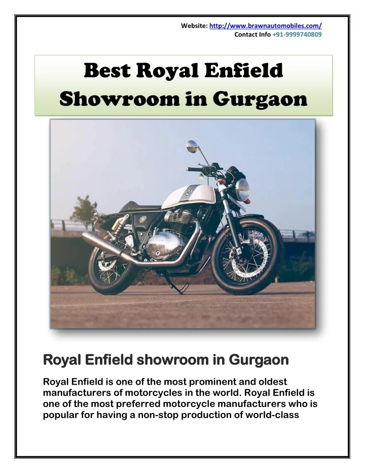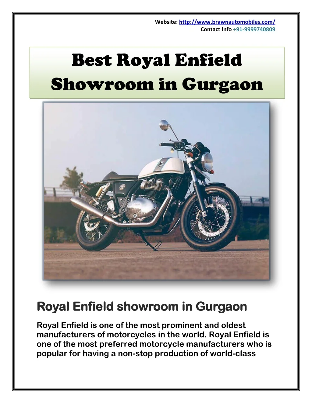 Website: http://www.brawnautomobiles.com/ Contact Info +91-9999740809 Best Royal Enfield Showroom in Gurgaon R Ro oy yal al Enf Enfield ield showr showroom in oom in Gur Gurg gaon aon Royal Enfield is one of the most prominent and oldest manufacturers of motorcycles in the world. Royal Enfield is one of the most preferred motorcycle manufacturers who is popular for having a non-stop production of world-class