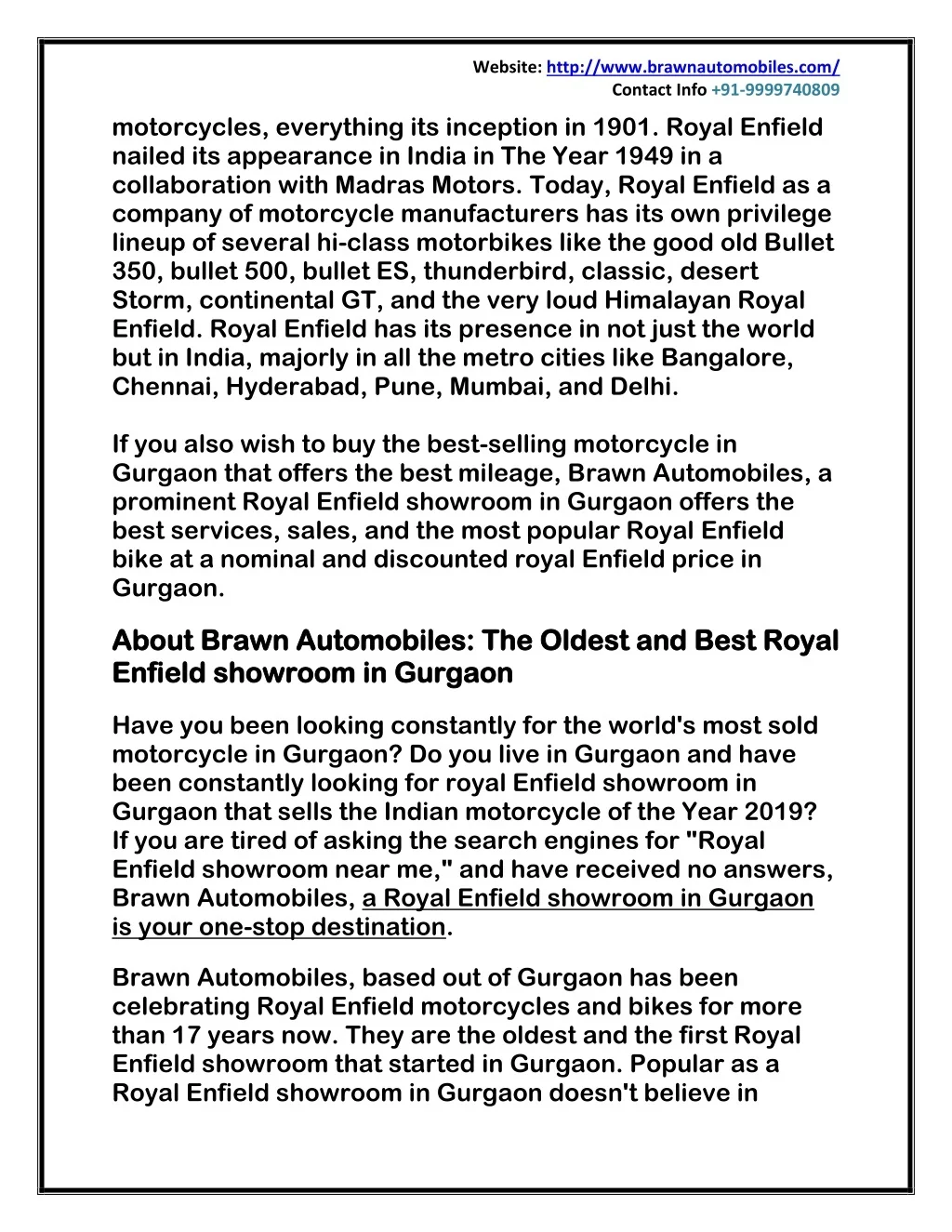 Website: http://www.brawnautomobiles.com/ Contact Info +91-9999740809 motorcycles, everything its inception in 1901. Royal Enfield nailed its appearance in India in The Year 1949 in a collaboration with Madras Motors. Today, Royal Enfield as a company of motorcycle manufacturers has its own privilege lineup of several hi-class motorbikes like the good old Bullet 350, bullet 500, bullet ES, thunderbird, classic, desert Storm, continental GT, and the very loud Himalayan Royal Enfield. Royal Enfield has its presence in not just the world but in India, majorly in all the metro cities like Bangalore, Chennai, Hyderabad, Pune, Mumbai, and Delhi. If you also wish to buy the best-selling motorcycle in Gurgaon that offers the best mileage, Brawn Automobiles, a prominent Royal Enfield showroom in Gurgaon offers the best services, sales, and the most popular Royal Enfield bike at a nominal and discounted royal Enfield price in Gurgaon. Abo About Enfi Enfield ut Br eld sho show wr roo Brawn awn Au Autom tomob oom in m in G Gur obi iles: les: Th urga gaon The O e Old ldest on est an and d Best Ro Best Royal yal Have you been looking constantly for the world's most sold motorcycle in Gurgaon? Do you live in Gurgaon and have been constantly looking for royal Enfield showroom in Gurgaon that sells the Indian motorcycle of the Year 2019? If you are tired of asking the search engines for "Royal Enfield showroom near me," and have received no answers, Brawn Automobiles, a Royal Enfield showroom in Gurgaon is your one-stop destination. Brawn Automobiles, based out of Gurgaon has been celebrating Royal Enfield motorcycles and bikes for more than 17 years now. They are the oldest and the first Royal Enfield showroom that started in Gurgaon. Popular as a Royal Enfield showroom in Gurgaon doesn't believe in