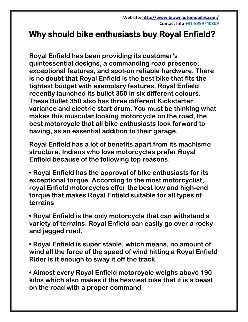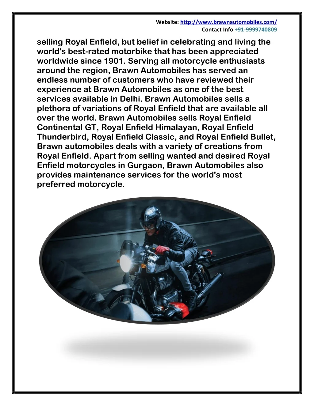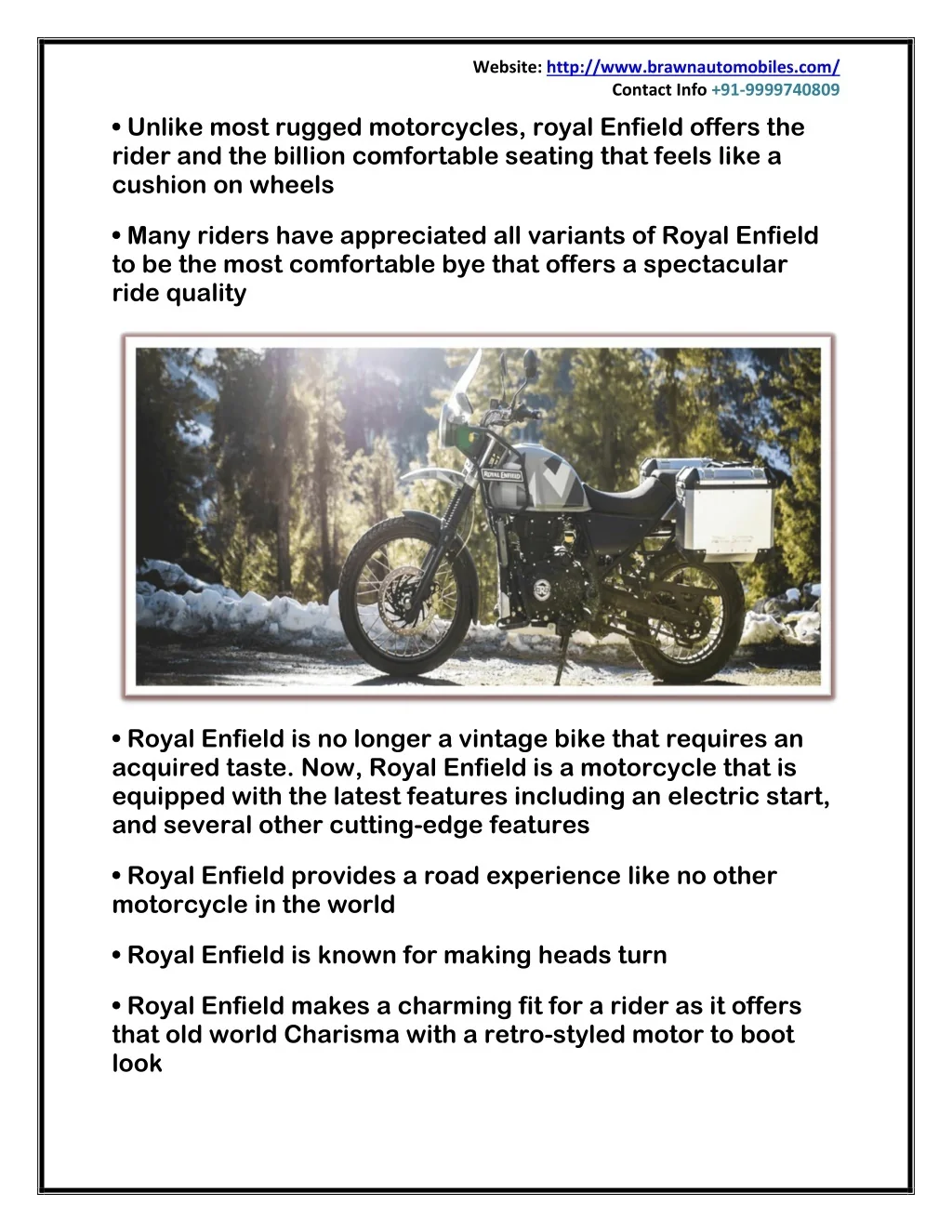 Website: http://www.brawnautomobiles.com/ Contact Info +91-9999740809 • • Unlike most rugged motorcycles, royal Enfield offers the rider and the billion comfortable seating that feels like a cushion on wheels • • Many riders have appreciated all variants of Royal Enfield to be the most comfortable bye that offers a spectacular ride quality • • Royal Enfield is no longer a vintage bike that requires an acquired taste. Now, Royal Enfield is a motorcycle that is equipped with the latest features including an electric start, and several other cutting-edge features • • Royal Enfield provides a road experience like no other motorcycle in the world • • Royal Enfield is known for making heads turn • • Royal Enfield makes a charming fit for a rider as it offers that old world Charisma with a retro-styled motor to boot look