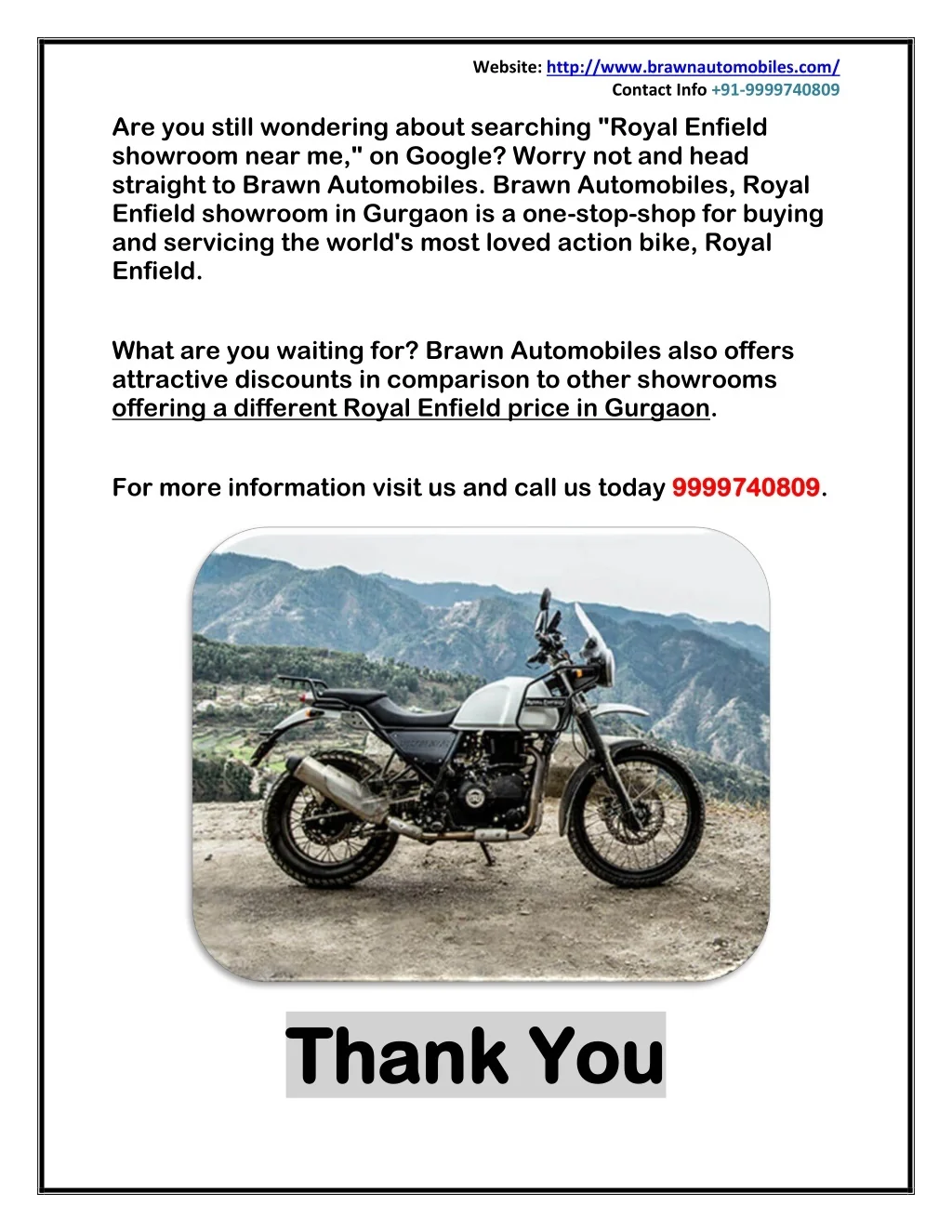 Website: http://www.brawnautomobiles.com/ Contact Info +91-9999740809 Are you still wondering about searching "Royal Enfield showroom near me," on Google? Worry not and head straight to Brawn Automobiles. Brawn Automobiles, Royal Enfield showroom in Gurgaon is a one-stop-shop for buying and servicing the world's most loved action bike, Royal Enfield. What are you waiting for? Brawn Automobiles also offers attractive discounts in comparison to other showrooms offering a different Royal Enfield price in Gurgaon. 0809 9. For more information visit us and call us today 9 99 99974 9974080 Than Thank Yo k You u