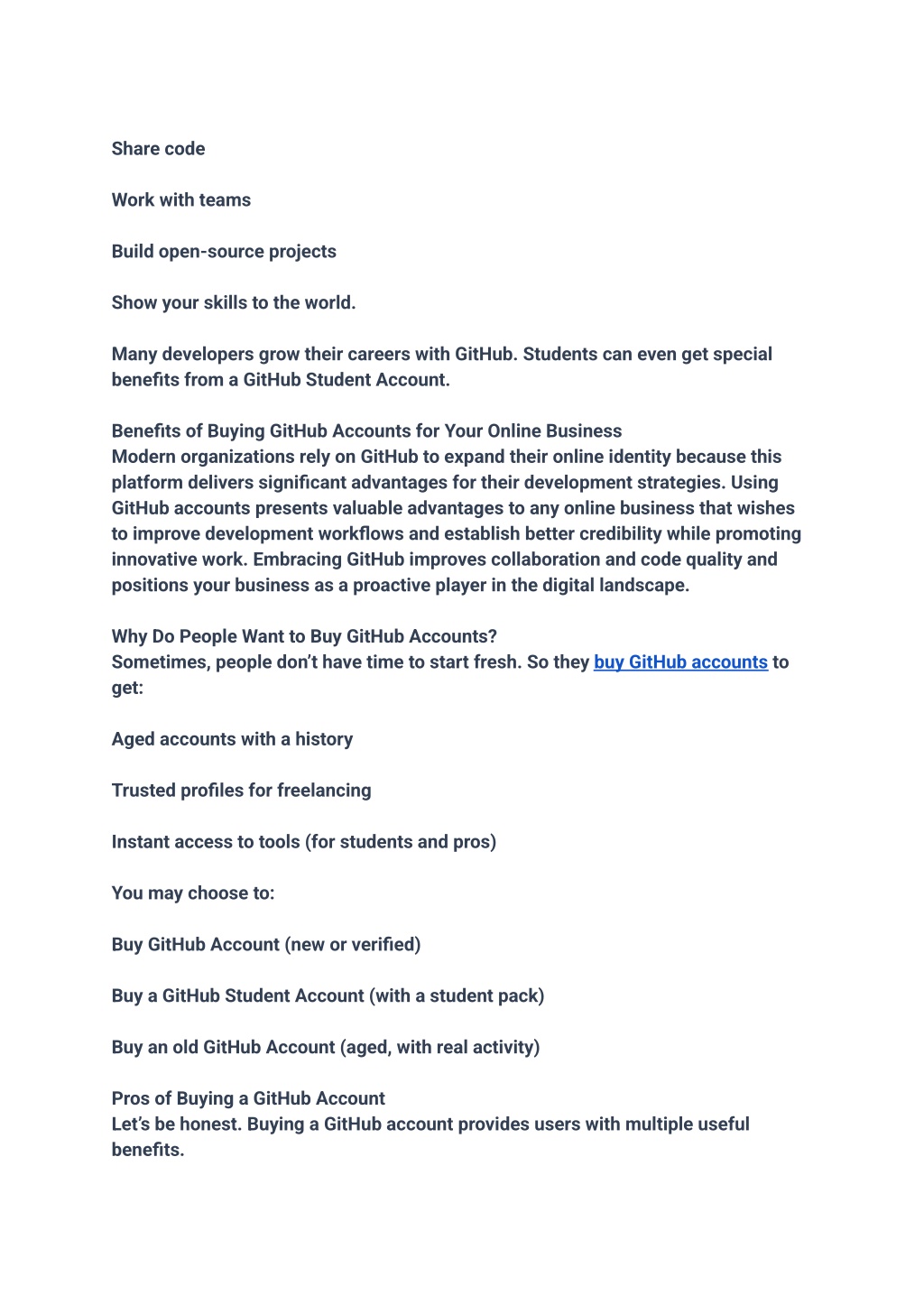 Share code Work with teams Build open-source projects Show your skills to the world. Many developers grow their careers with GitHub. Students can even get special benefits from a GitHub Student Account. Benefits of Buying GitHub Accounts for Your Online Business Modern organizations rely on GitHub to expand their online identity because this platform delivers significant advantages for their development strategies. Using GitHub accounts presents valuable advantages to any online business that wishes to improve development workflows and establish better credibility while promoting innovative work. Embracing GitHub improves collaboration and code quality and positions your business as a proactive player in the digital landscape. Why Do People Want to Buy GitHub Accounts? Sometimes, people don’t have time to start fresh. So they buy GitHub accounts to get: Aged accounts with a history Trusted profiles for freelancing Instant access to tools (for students and pros) You may choose to: Buy GitHub Account (new or verified) Buy a GitHub Student Account (with a student pack) Buy an old GitHub Account (aged, with real activity) Pros of Buying a GitHub Account Let’s be honest. Buying a GitHub account provides users with multiple useful benefits.