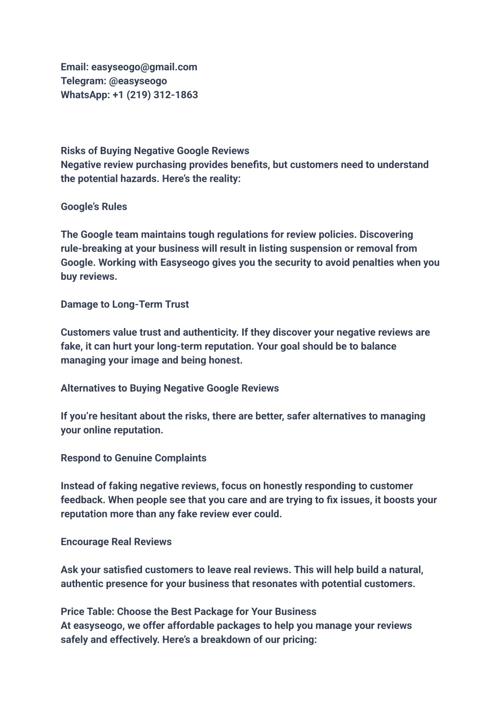 Email: easyseogo@gmail.com Telegram: @easyseogo WhatsApp: +1 (219) 312-1863 Risks of Buying Negative Google Reviews Negative review purchasing provides benefits, but customers need to understand the potential hazards. Here’s the reality: Google’s Rules The Google team maintains tough regulations for review policies. Discovering rule-breaking at your business will result in listing suspension or removal from Google. Working with Easyseogo gives you the security to avoid penalties when you buy reviews. Damage to Long-Term Trust Customers value trust and authenticity. If they discover your negative reviews are fake, it can hurt your long-term reputation. Your goal should be to balance managing your image and being honest. Alternatives to Buying Negative Google Reviews If you’re hesitant about the risks, there are better, safer alternatives to managing your online reputation. Respond to Genuine Complaints Instead of faking negative reviews, focus on honestly responding to customer feedback. When people see that you care and are trying to fix issues, it boosts your reputation more than any fake review ever could. Encourage Real Reviews Ask your satisfied customers to leave real reviews. This will help build a natural, authentic presence for your business that resonates with potential customers. Price Table: Choose the Best Package for Your Business At easyseogo, we offer affordable packages to help you manage your reviews safely and effectively. Here’s a breakdown of our pricing: